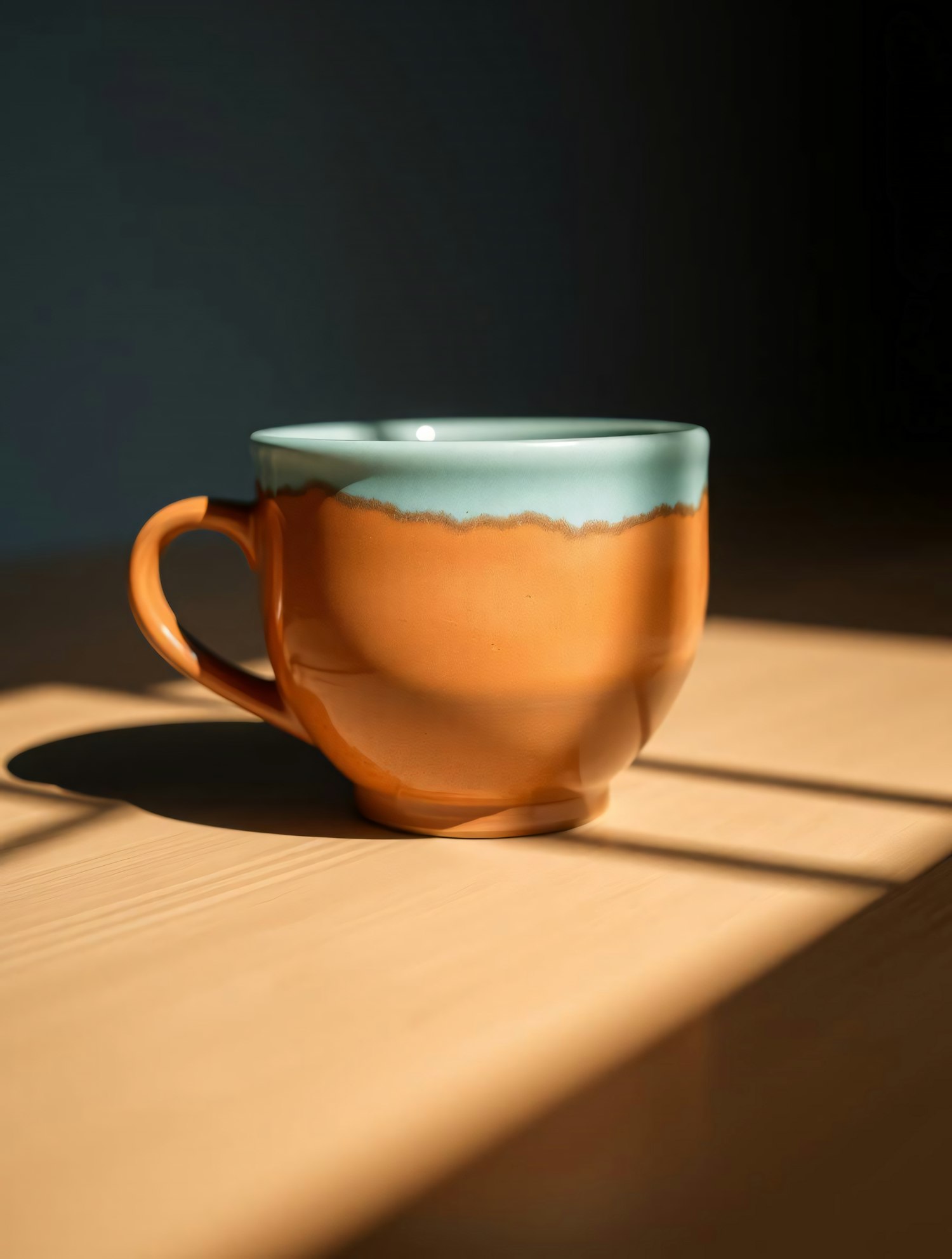 A two-tone ceramic mug in sunlight on a wooden table, with teal and terracotta colors creating a warm, inviting scene.