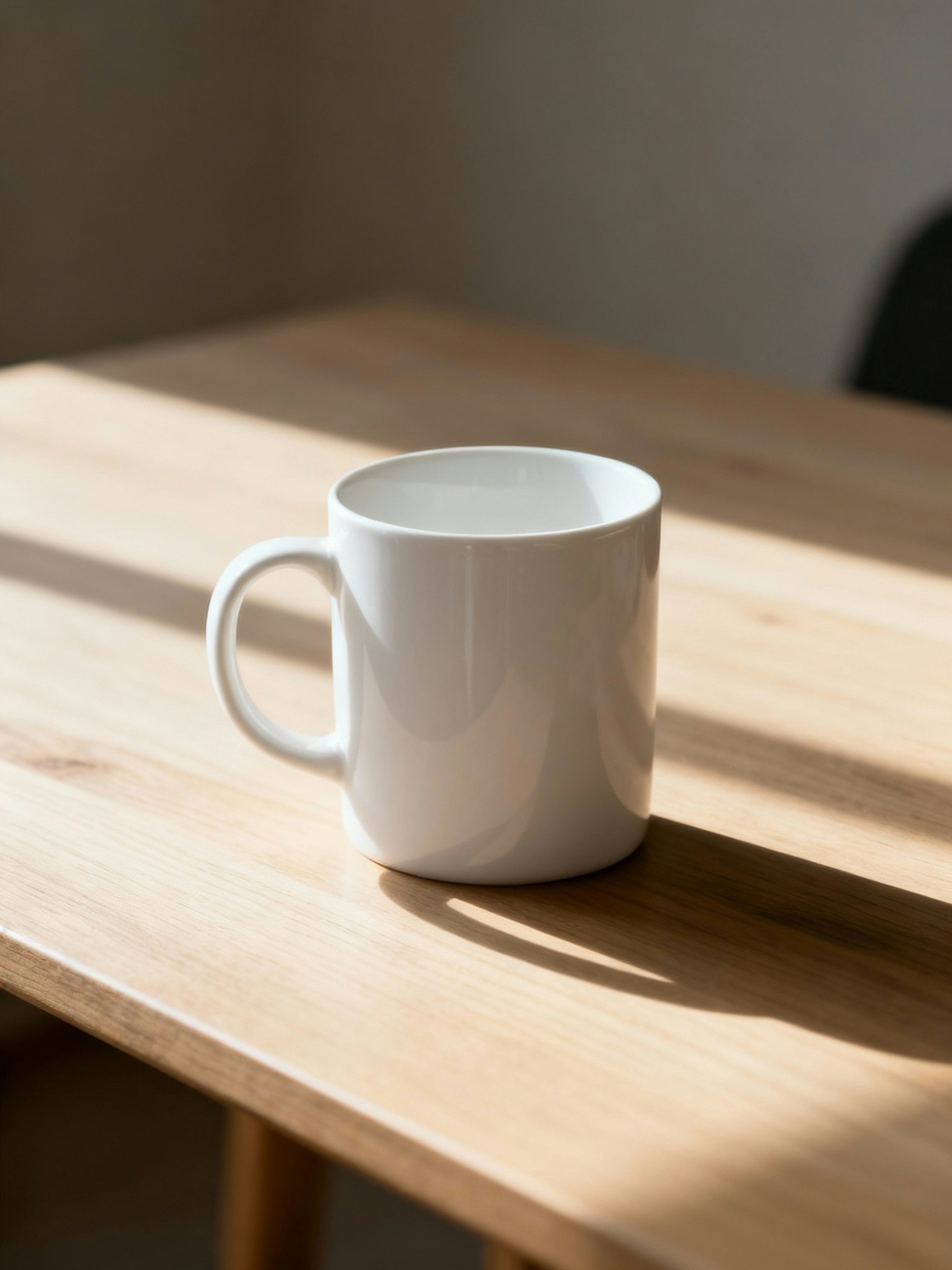 A white ceramic mug on a wooden table, illuminated by soft natural light, creating a serene and minimalist atmosphere.