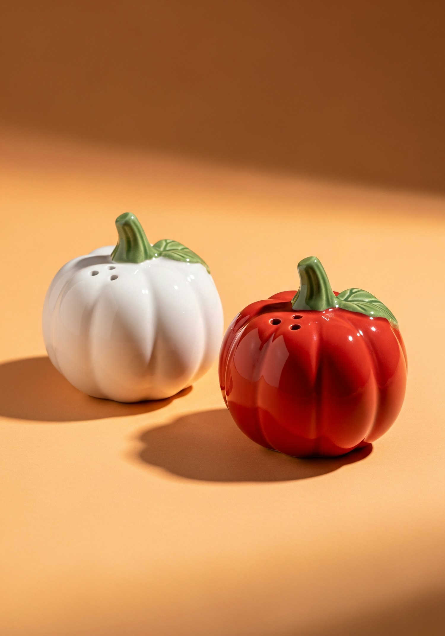 Ceramic pumpkin-shaped salt and pepper shakers in white and red with green stems, set against a warm orange background.