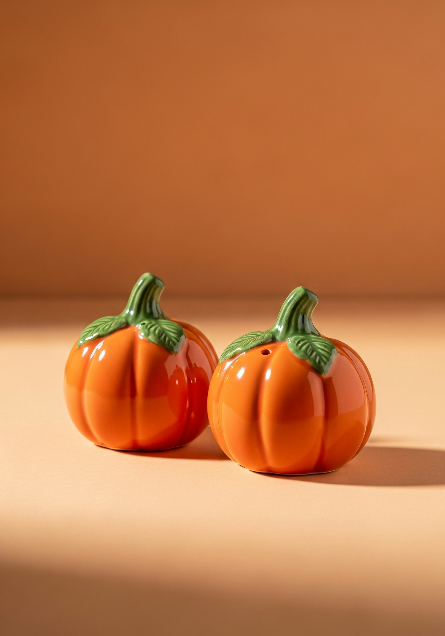 Two ceramic pumpkin-shaped salt and pepper shakers on a warm orange background, perfect for autumn-themed decor.