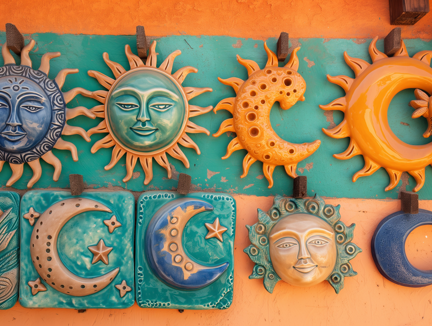 Colorful ceramic sun and moon wall hangings on a vibrant orange and teal background, showcasing intricate designs and cultural artistry.