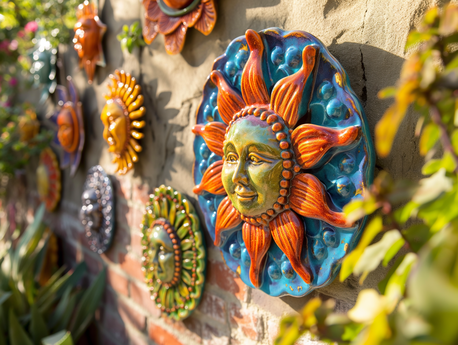 Colorful ceramic sun faces on a rustic wall, surrounded by greenery, create a vibrant and artistic outdoor display.