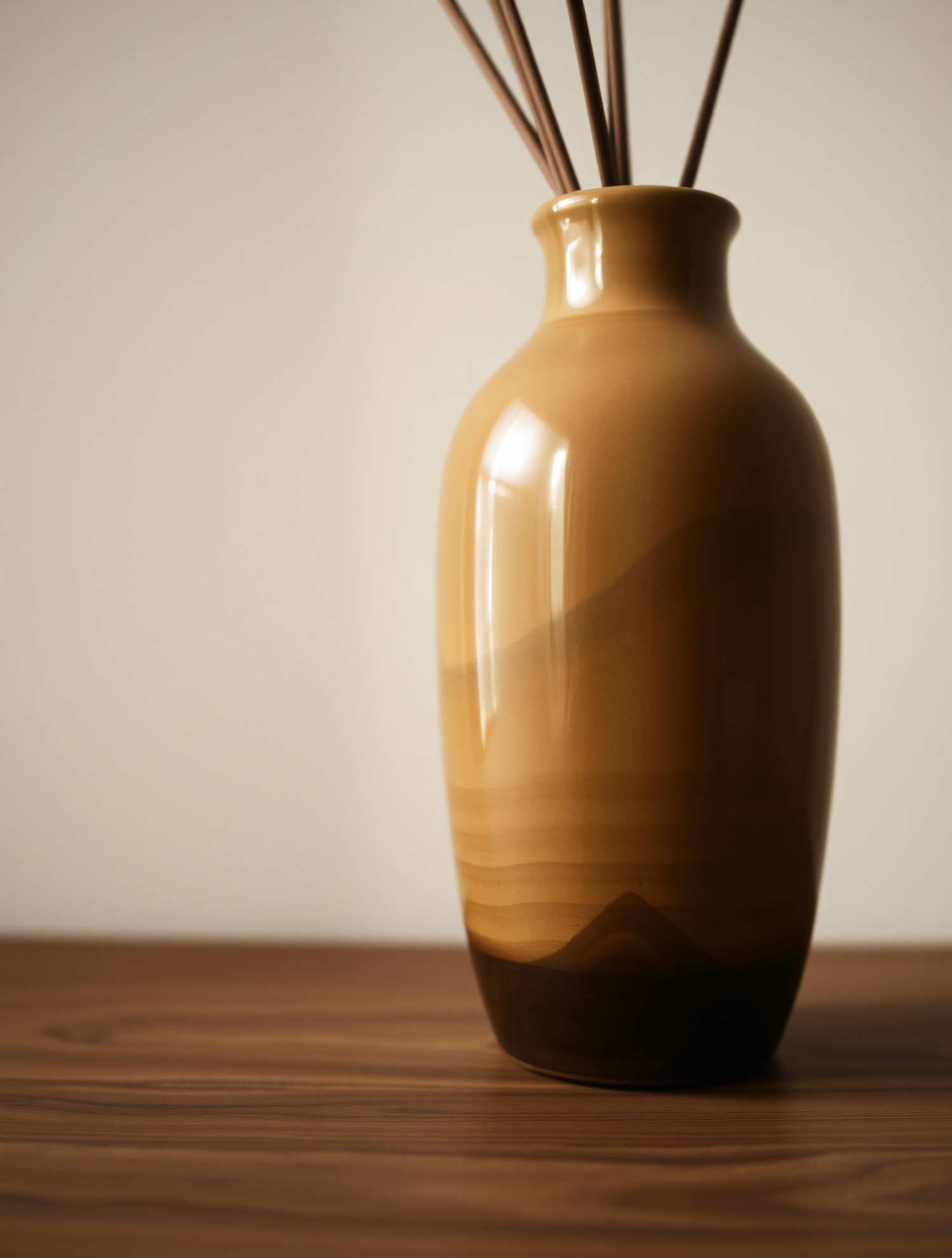 Elegant ceramic vase with warm brown gradient and reed sticks on a wooden surface, exuding calm and sophistication.