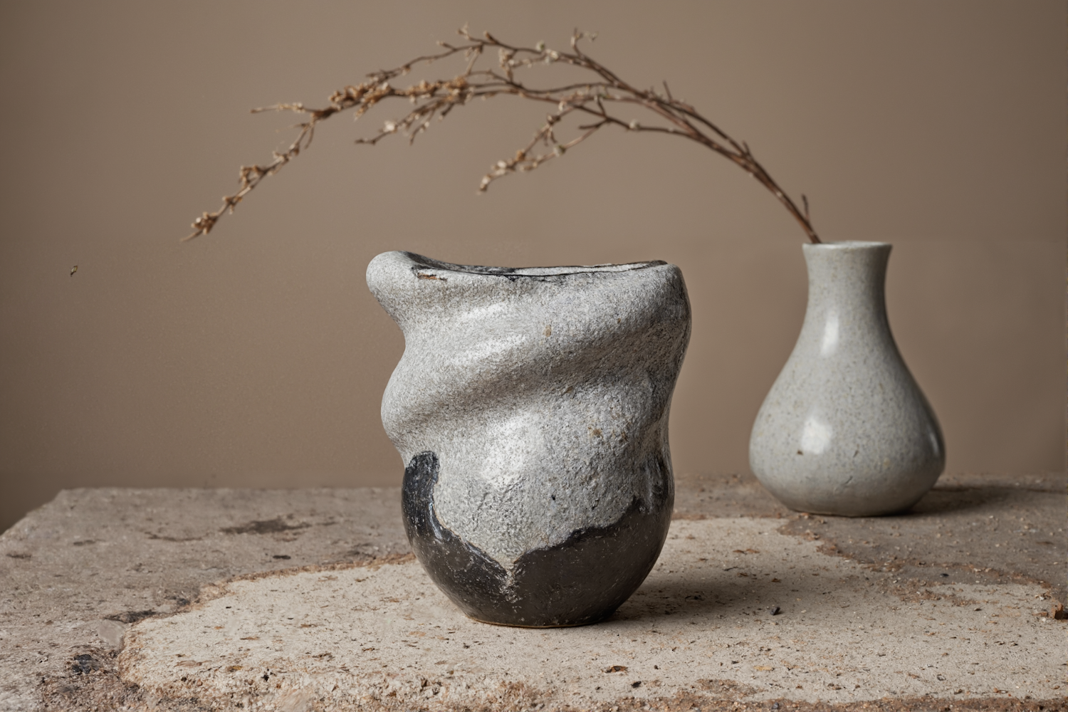 Artisanal ceramic vases on a stone surface, featuring unique shapes and earthy tones, creating a rustic and natural aesthetic.