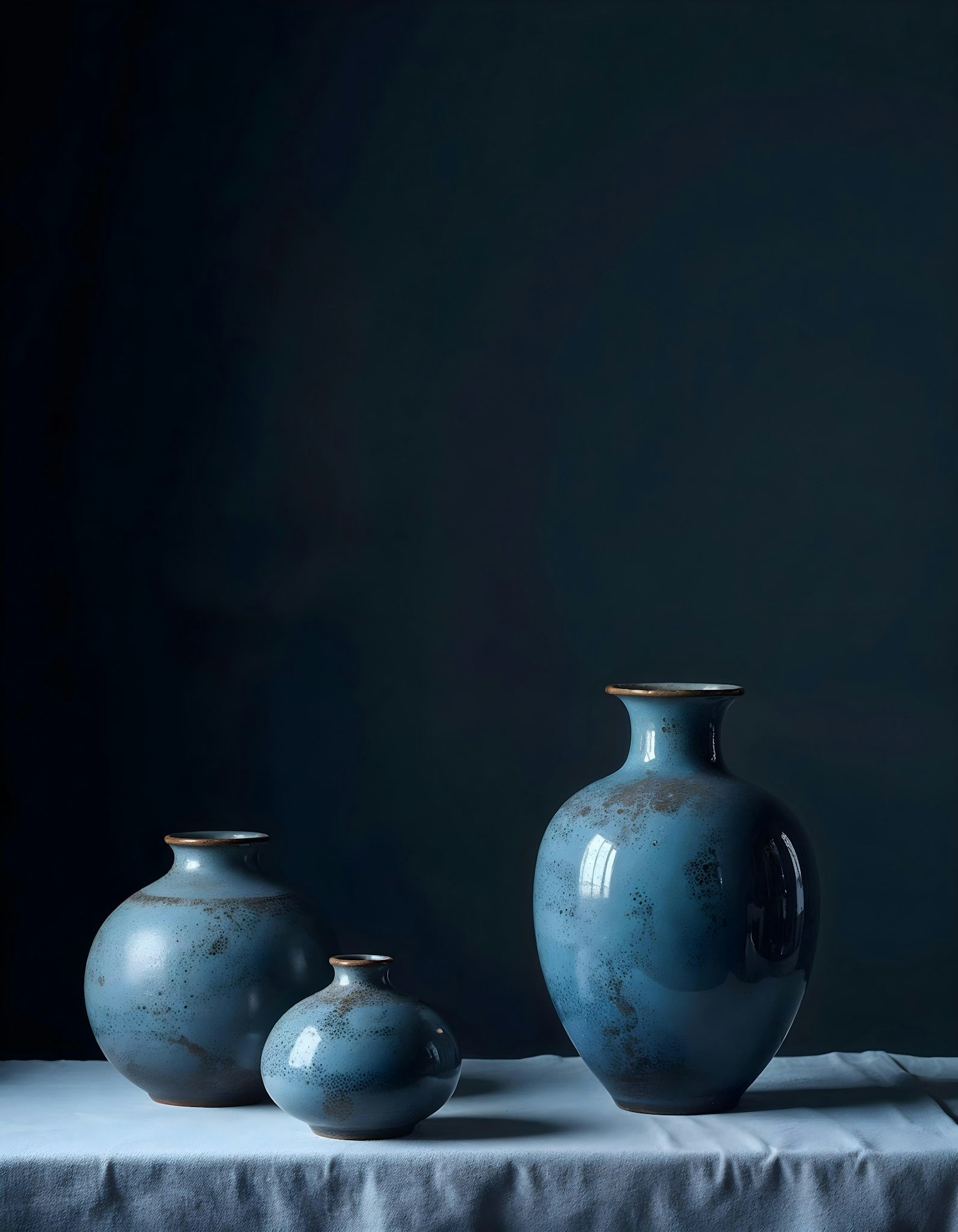 Elegant blue ceramic vases on a white cloth, set against a dark background, showcasing minimalist design and glossy textures.