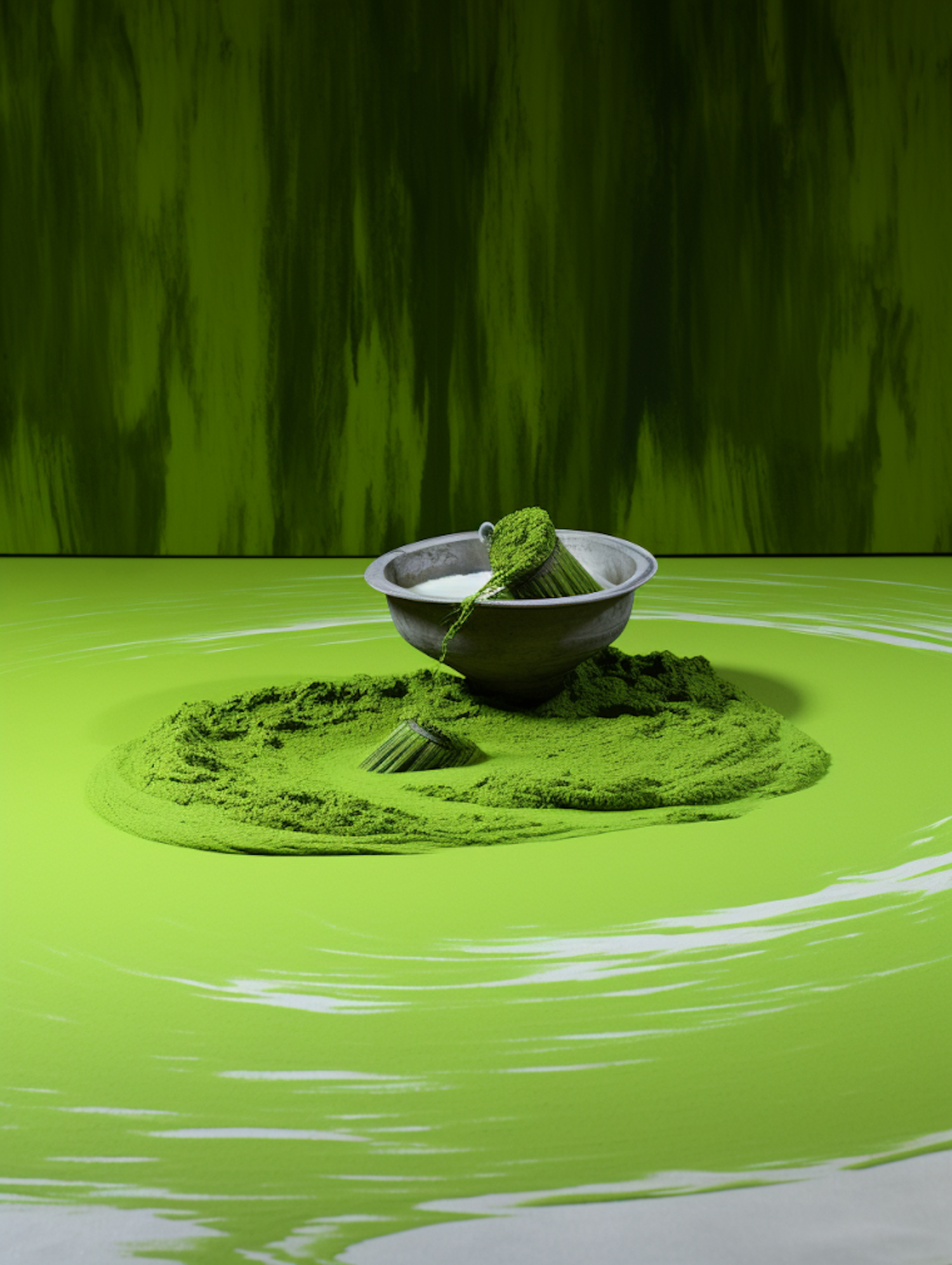 Traditional Japanese tea whisk in a mound of vibrant green matcha powder, set in a metallic bowl with swirling matcha patterns.