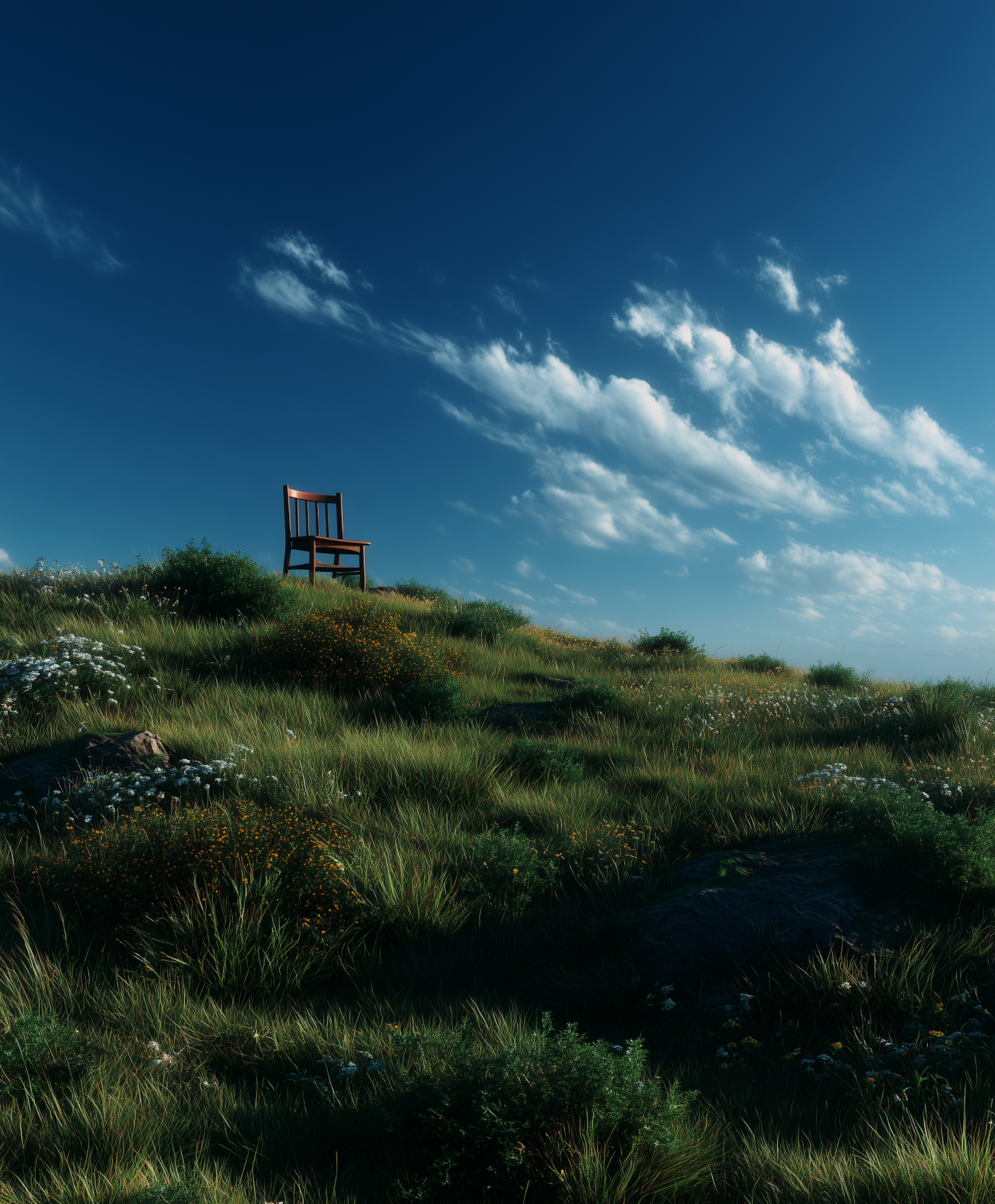 A wooden chair sits alone on a grassy hill under a clear blue sky with scattered clouds, evoking solitude and serenity.