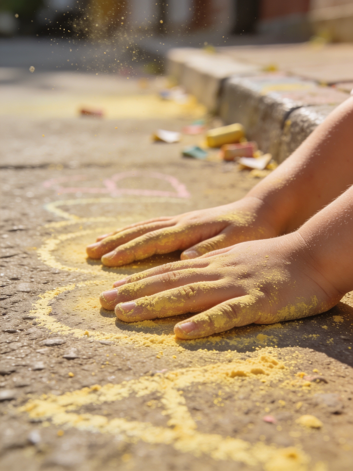Close-up of a child's hands covered in yellow chalk dust, creating art on a sunlit pavement with colorful chalk pieces scattered around.