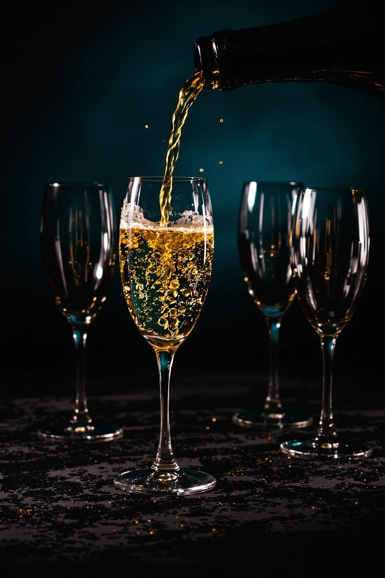 Golden champagne being poured into a flute, surrounded by empty glasses, set against a rich teal background.