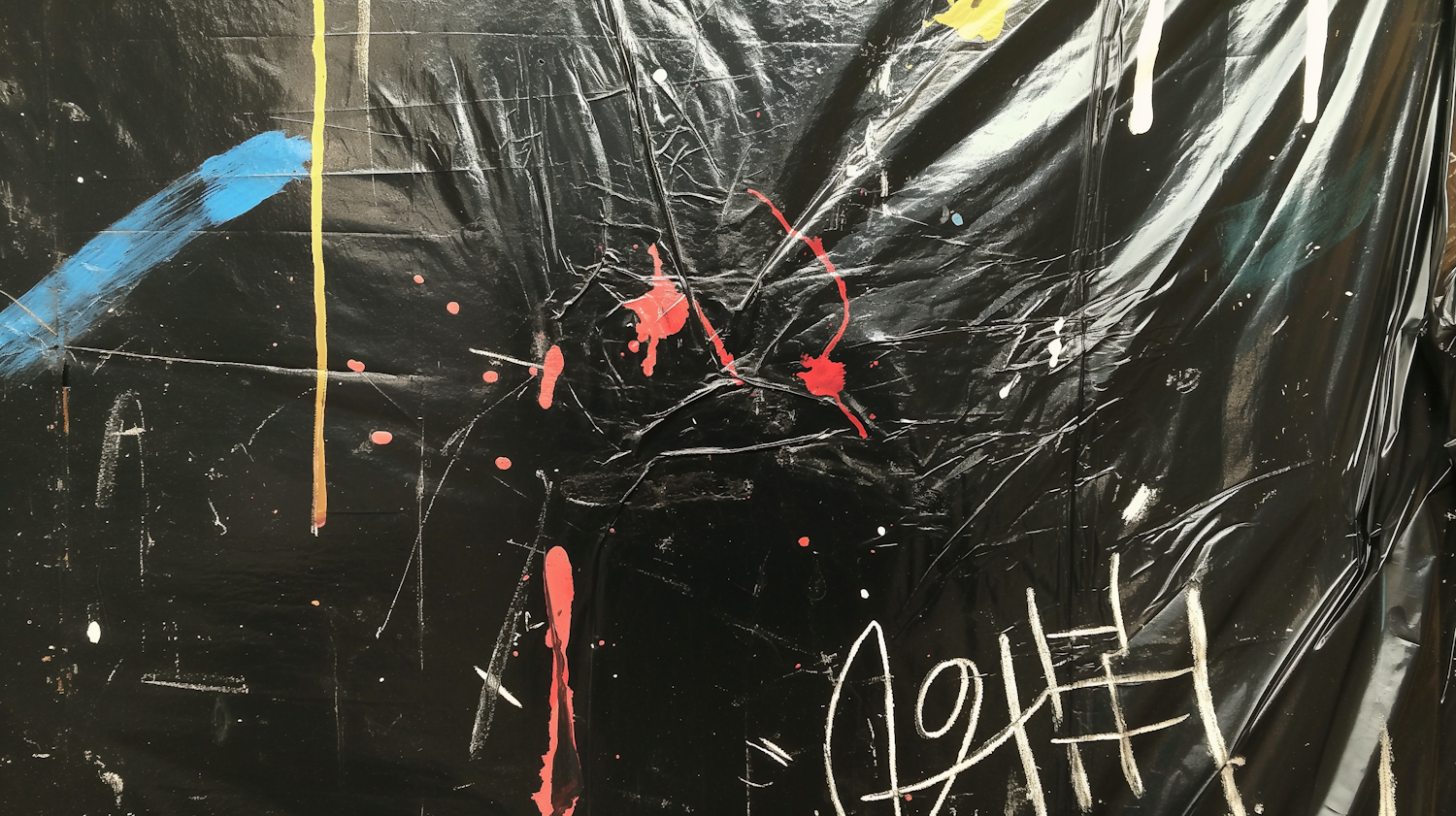 Abstract art with bold blue and yellow strokes, red splatters, and white chalk markings on a textured black surface.
