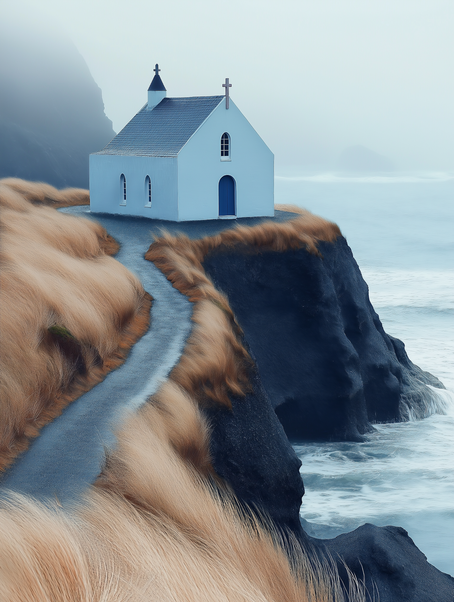A quaint white chapel with a blue door perched on a cliff, surrounded by golden grasses and overlooking a misty ocean.