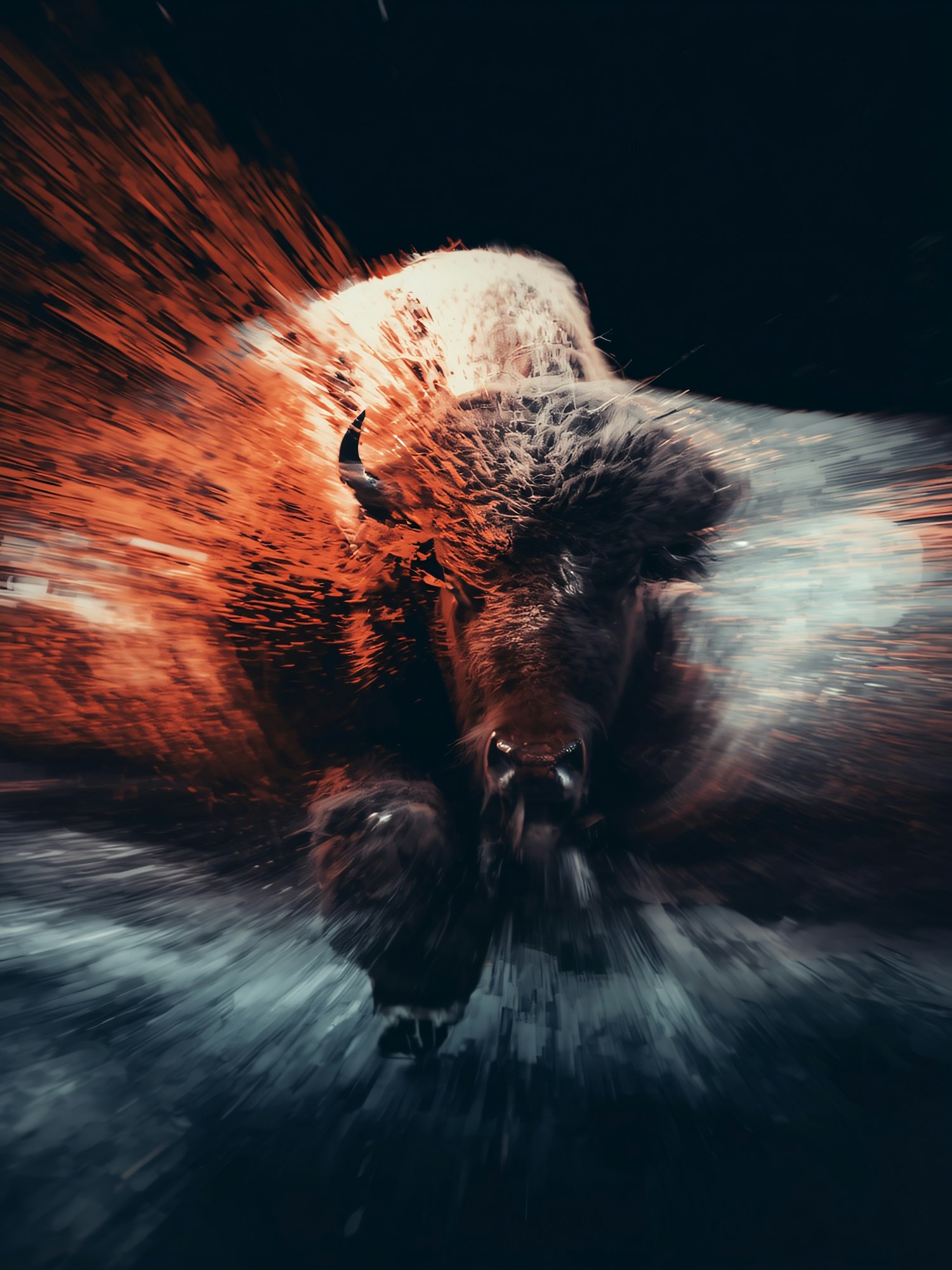 A powerful bison charging forward, surrounded by dynamic streaks of orange and blue, creating a sense of motion and energy.