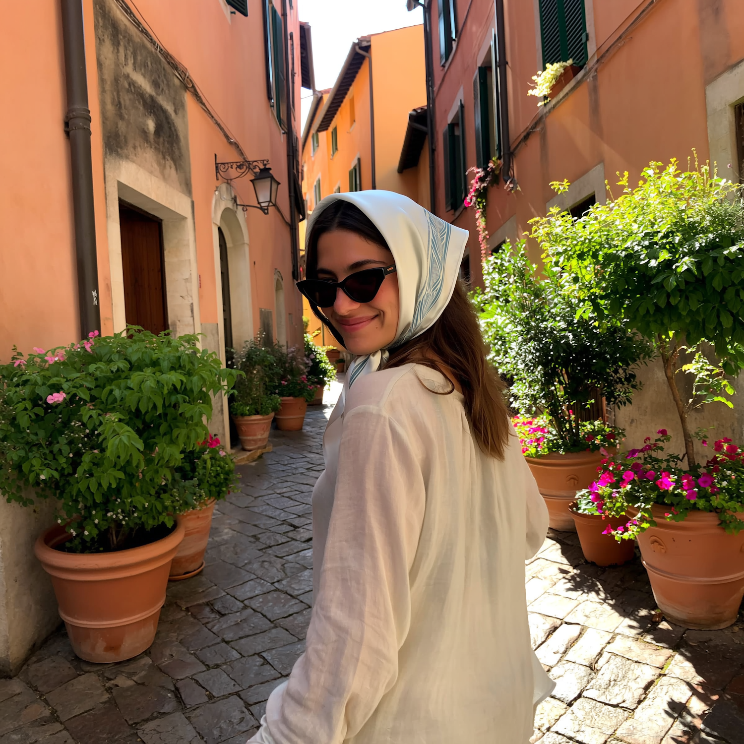 A woman in a white blouse and headscarf smiles while walking through a sunny, plant-lined cobblestone alley in a colorful European village.