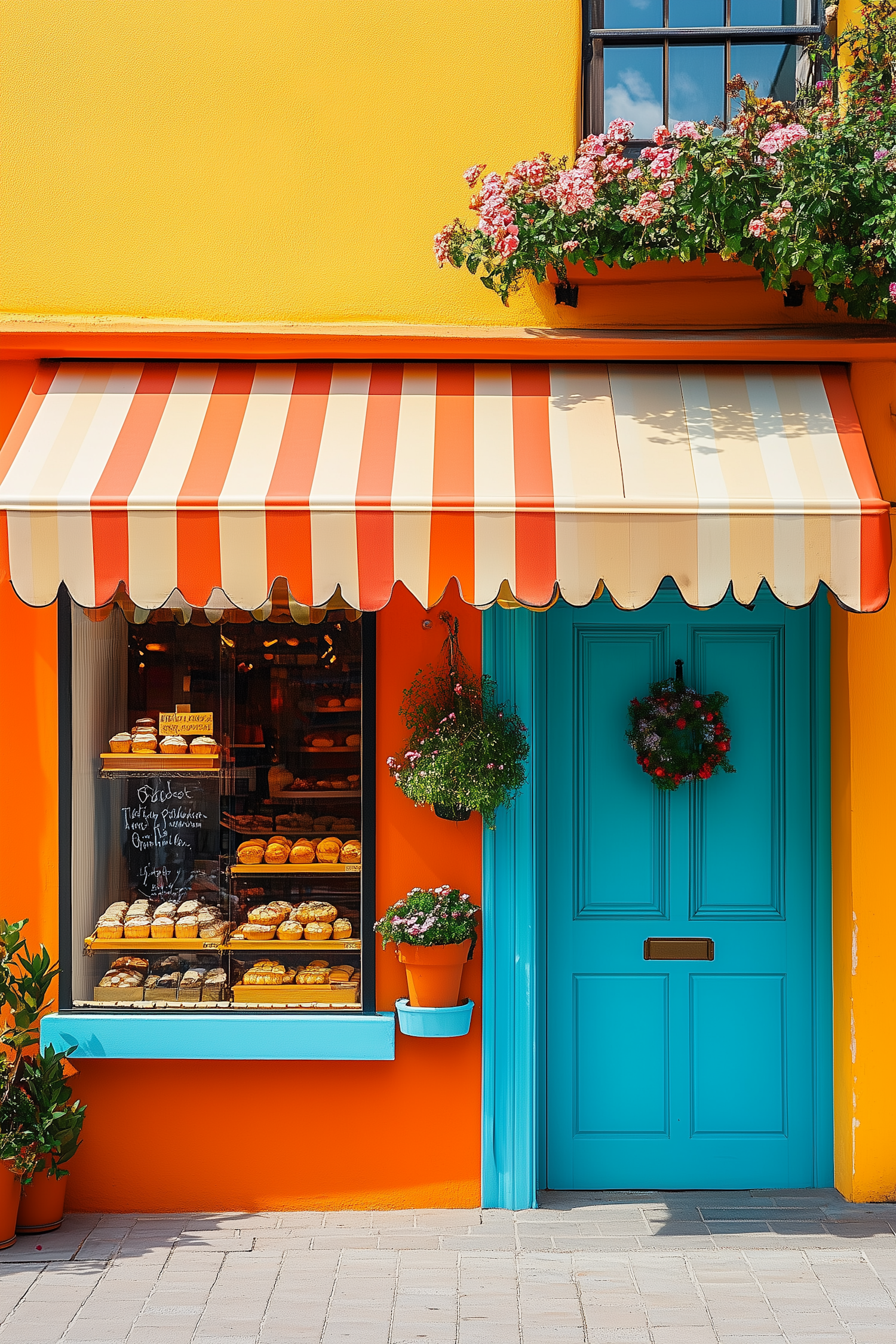 Bright bakery storefront with colorful facade, striped awning, turquoise door, and fresh bread on display. Perfectly charming and inviting.
