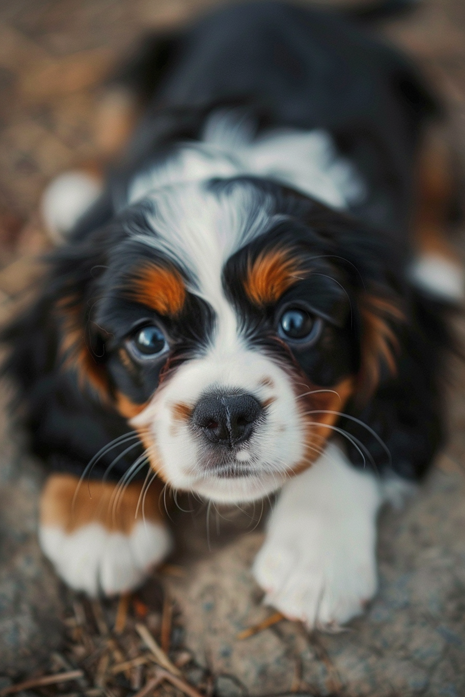 Adorable Cavalier King Charles Spaniel puppy with expressive eyes and fluffy coat, lying on a textured surface.