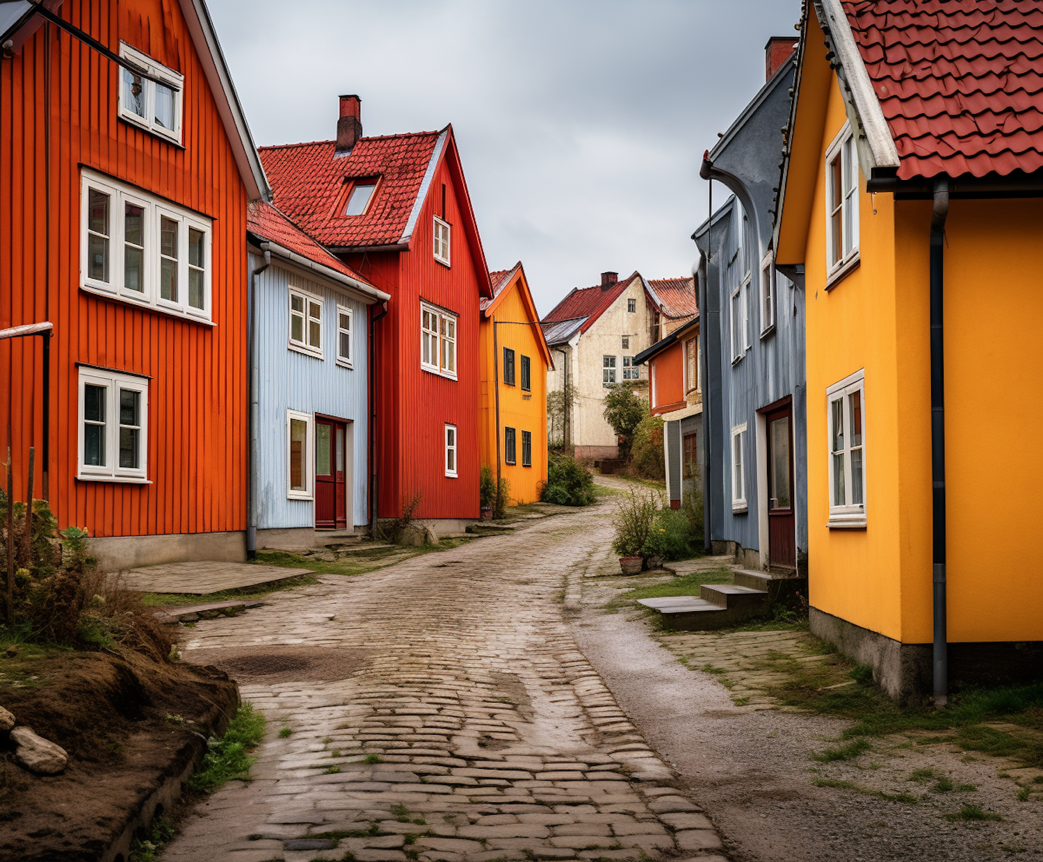 Charming village street with colorful wooden houses and cobblestone path under an overcast sky, creating a serene atmosphere.