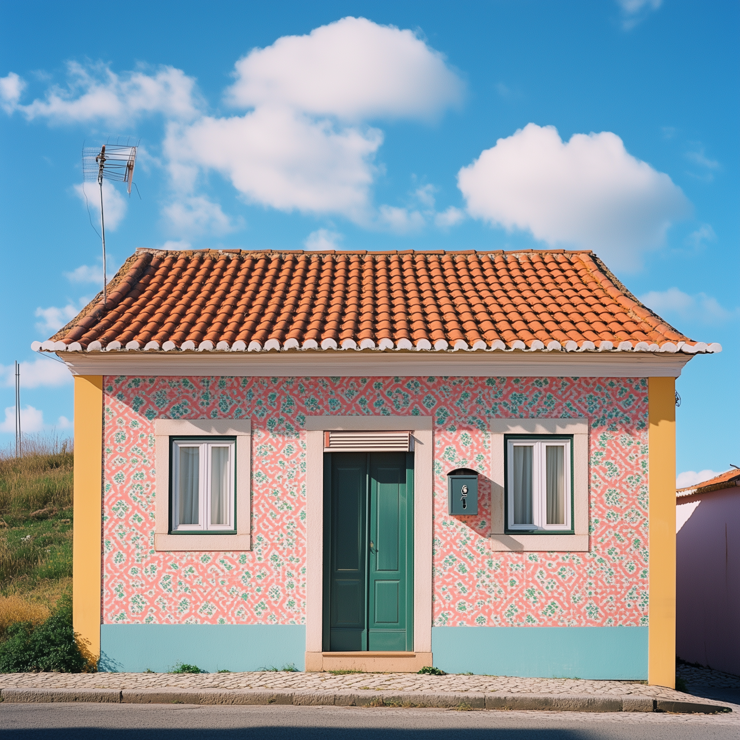 A small house with a pink and green floral tile facade, green door, and terracotta roof under a bright blue sky with fluffy clouds.