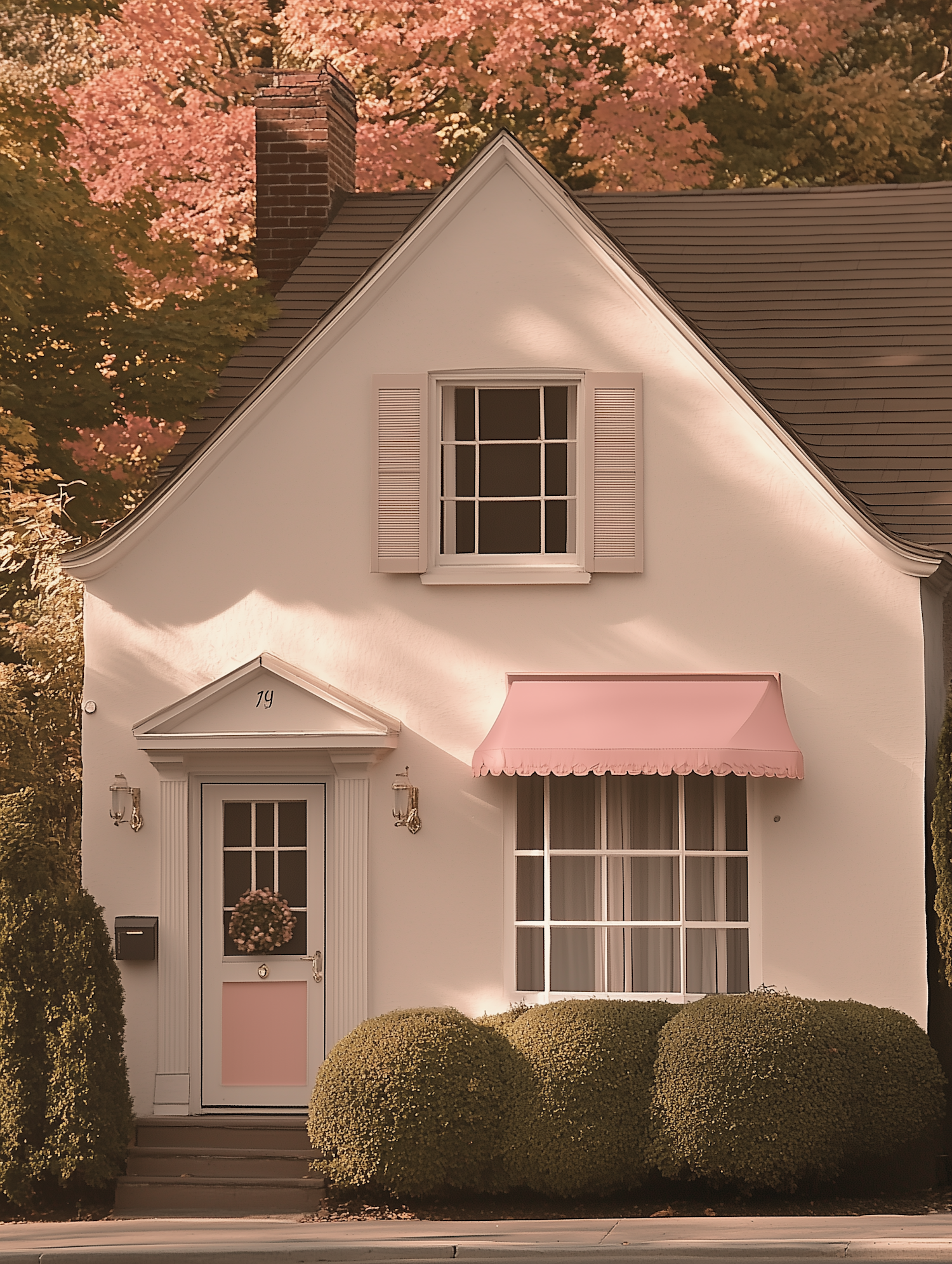 Charming white cottage with pink accents, surrounded by lush bushes and vibrant autumn trees. Perfect cozy home inspiration.