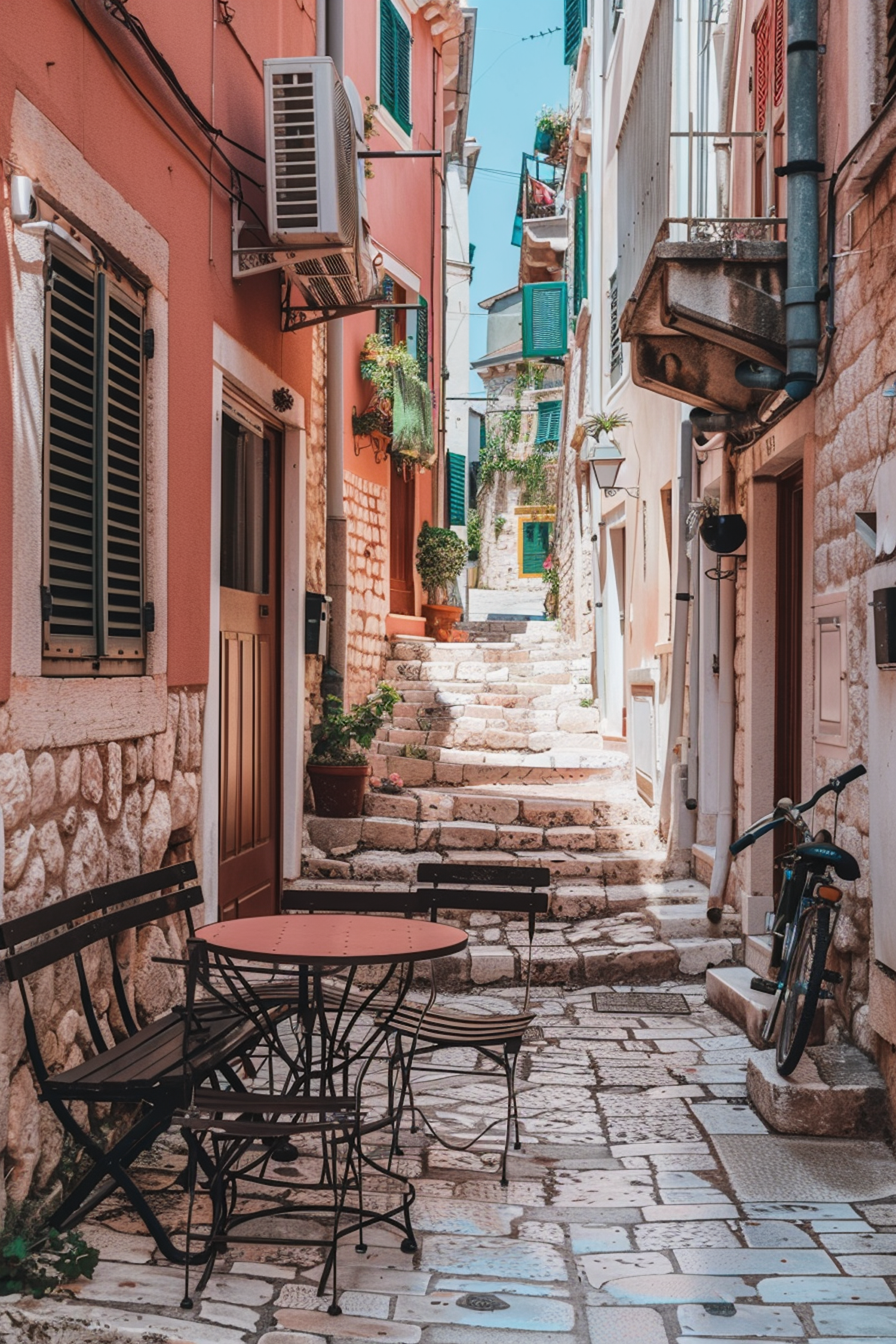 Charming Mediterranean alley with cobblestones, pastel buildings, green shutters, outdoor seating, and a bicycle leaning against the wall.
