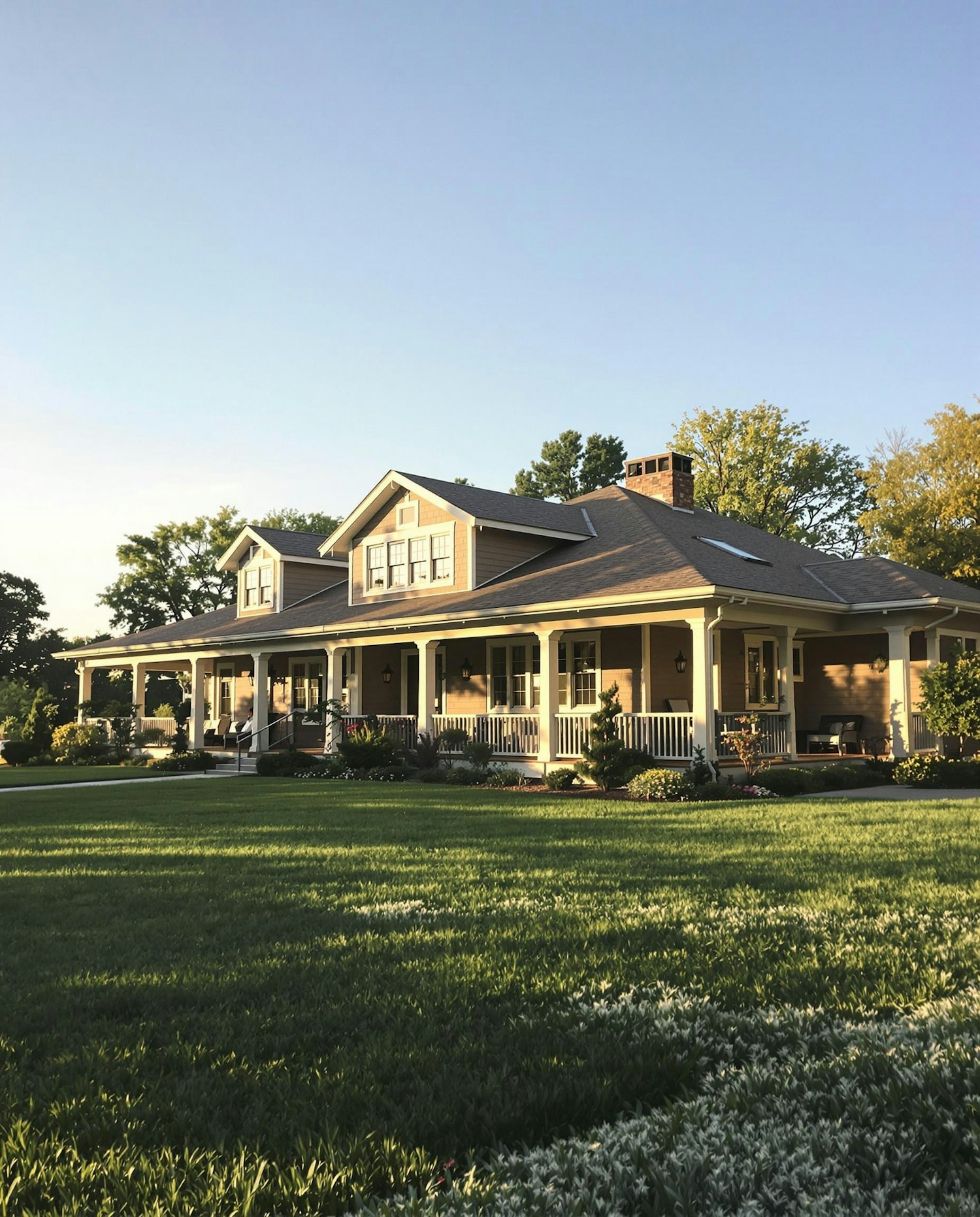 Façade of a prairie-style ranch house with wraparound porch. Captured under early morning sun.