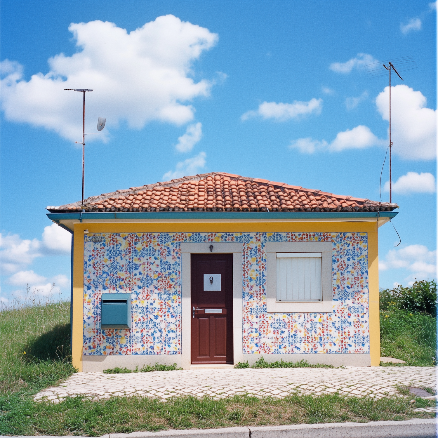 A small house with a floral facade, red-tiled roof, and antennas under a bright blue sky. Features a brown door, white shutter, and blue mailbox.