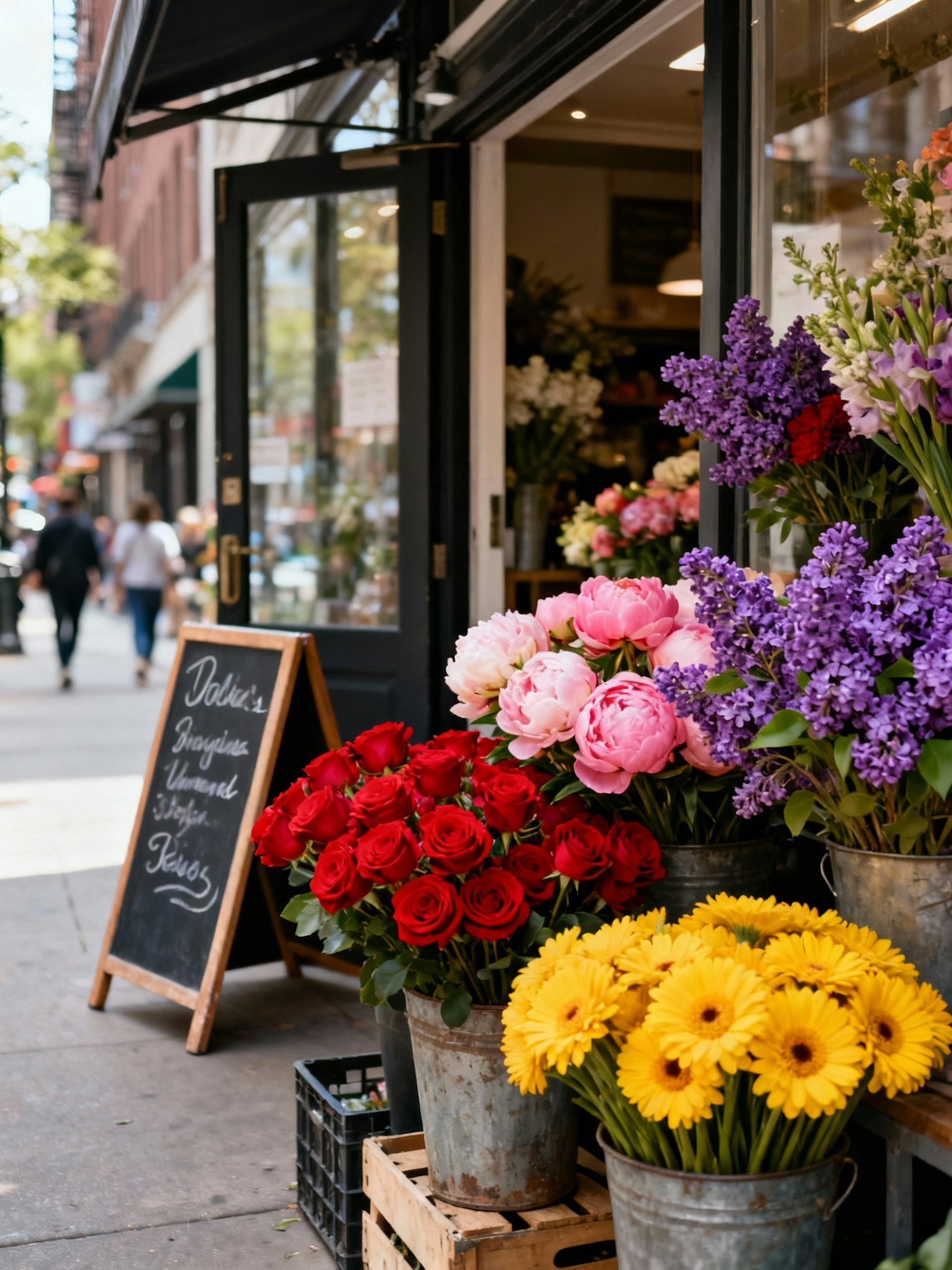 A charming flower shop display with colorful blooms in buckets, a chalkboard sign, and a bustling city street in the background.