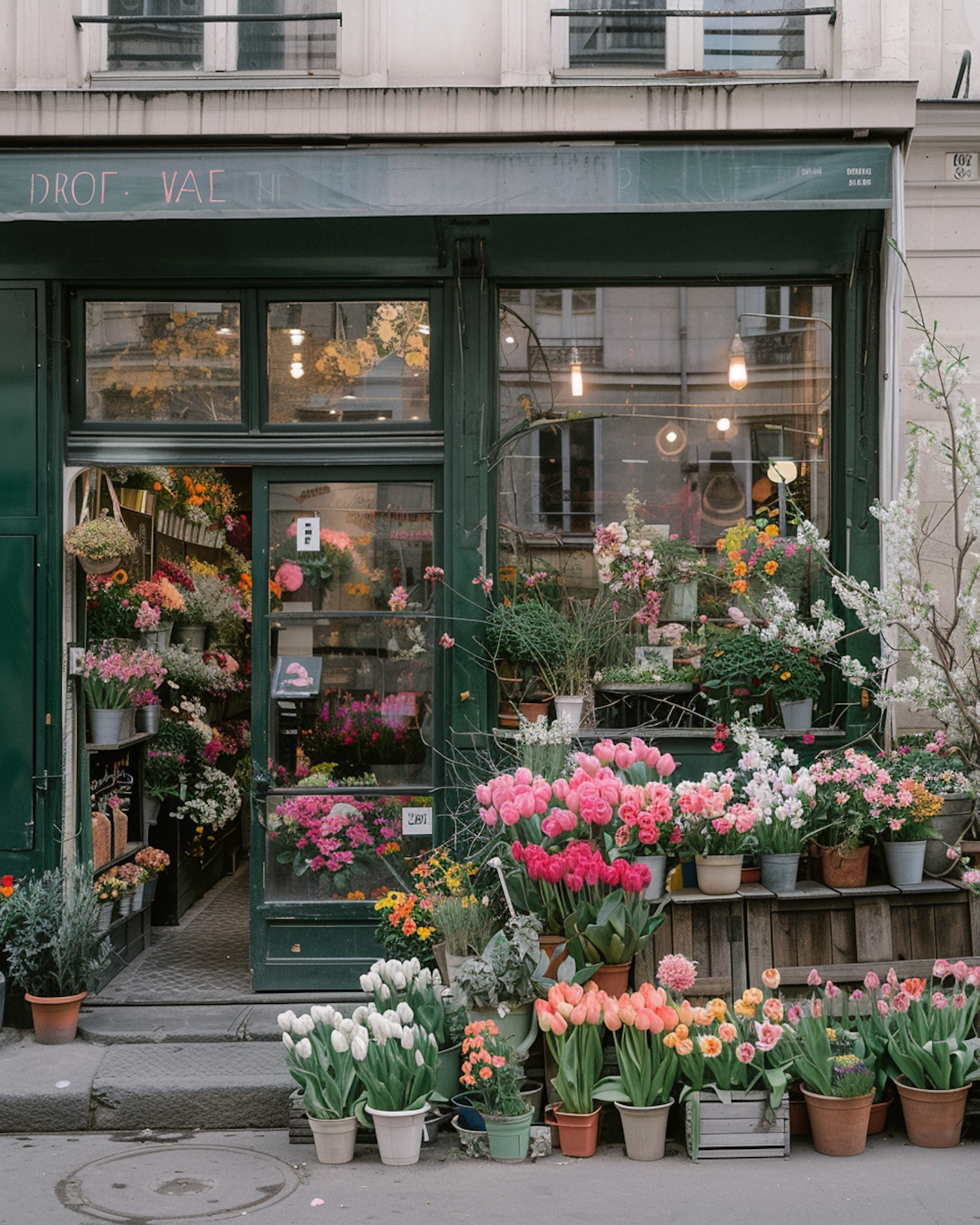 Charming flower shop with vibrant tulips and floral displays in a quaint European setting.