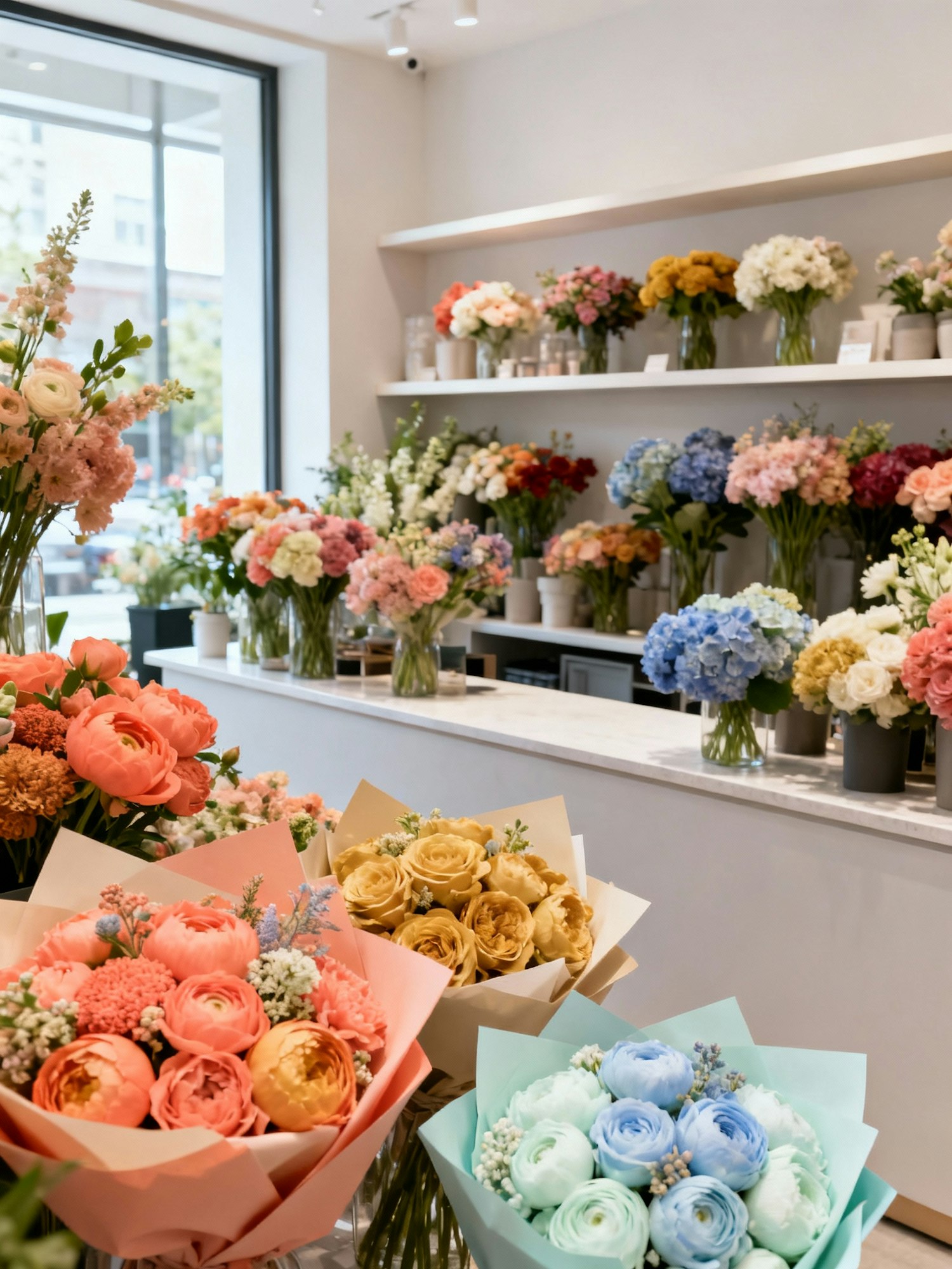 A vibrant flower shop with colorful bouquets and floral arrangements, beautifully displayed in a bright, modern interior.