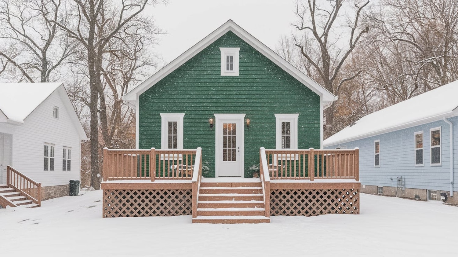 Cozy green house with white trim and a wooden porch in a snowy neighborhood, flanked by white and blue homes under a wintery sky.