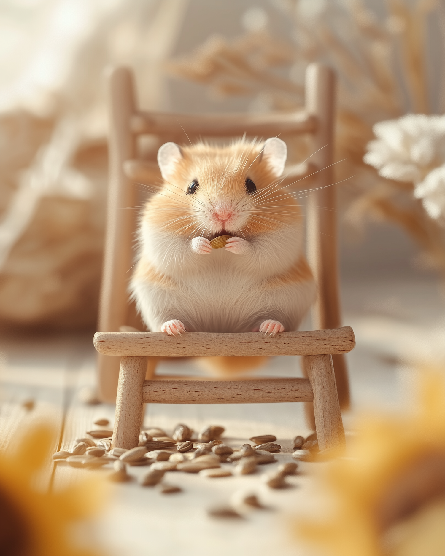 Adorable hamster with fluffy fur sits on a tiny wooden chair, holding a seed. Warm, cozy background with scattered sunflower seeds.