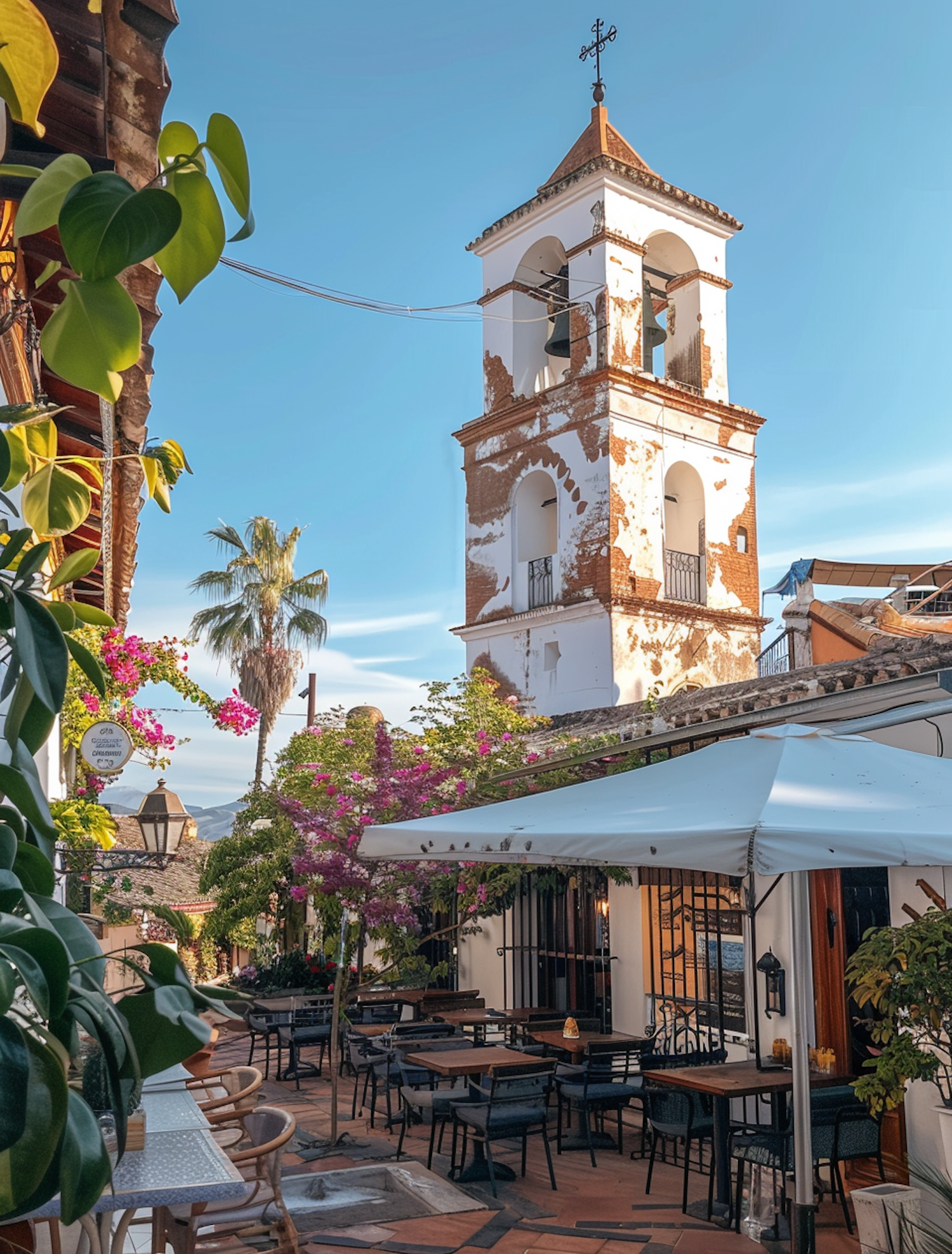 Charming outdoor café with rustic bell tower, lush greenery, and vibrant bougainvillea under a clear blue sky.