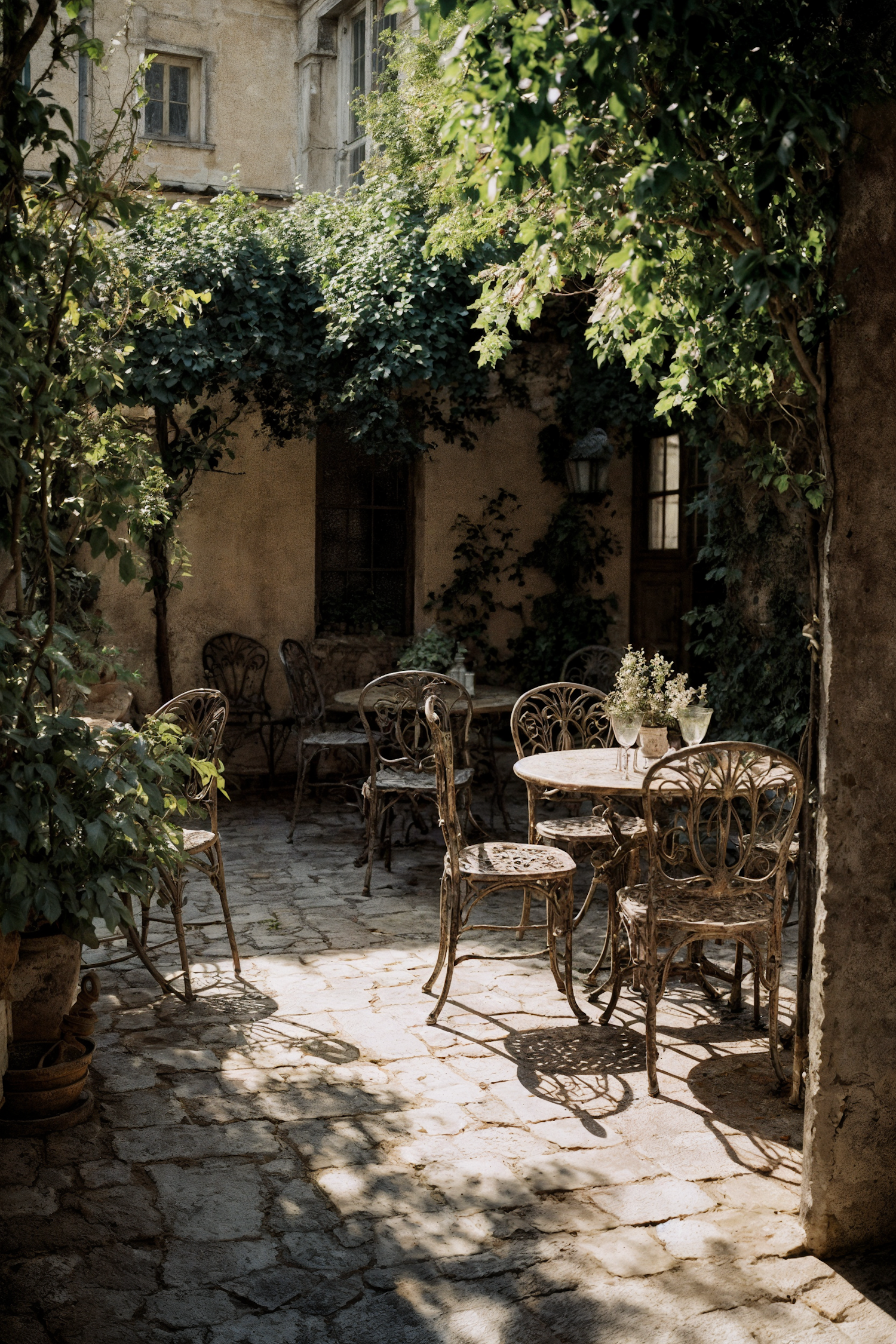 Cozy courtyard with vintage iron furniture, cobblestone floor, and lush greenery creating a serene and inviting ambiance.
