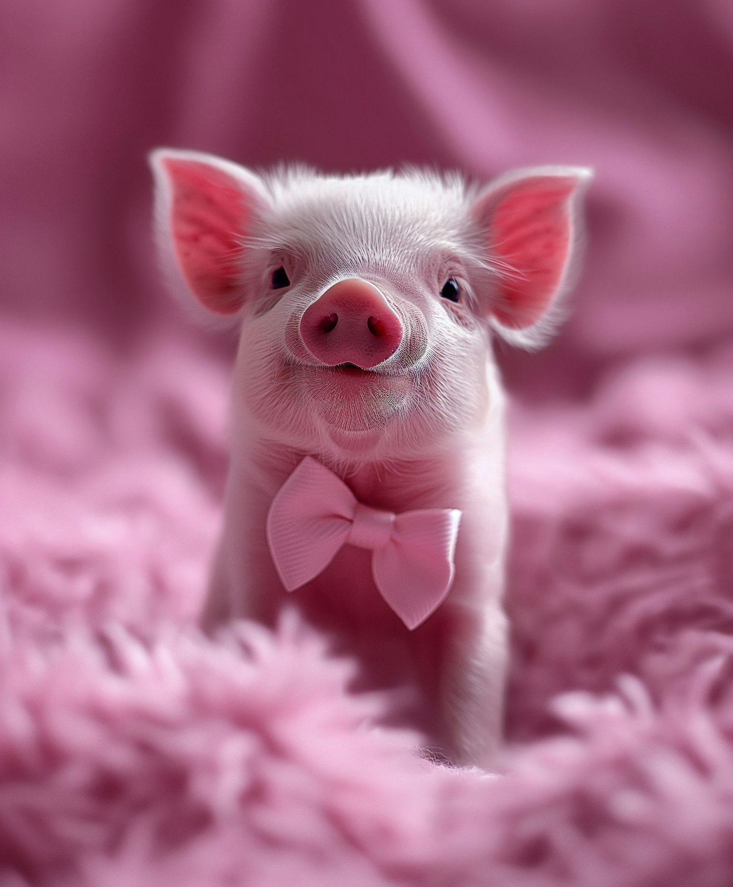 Adorable piglet with a pink bow tie on a fluffy pink blanket, exuding cuteness and charm.