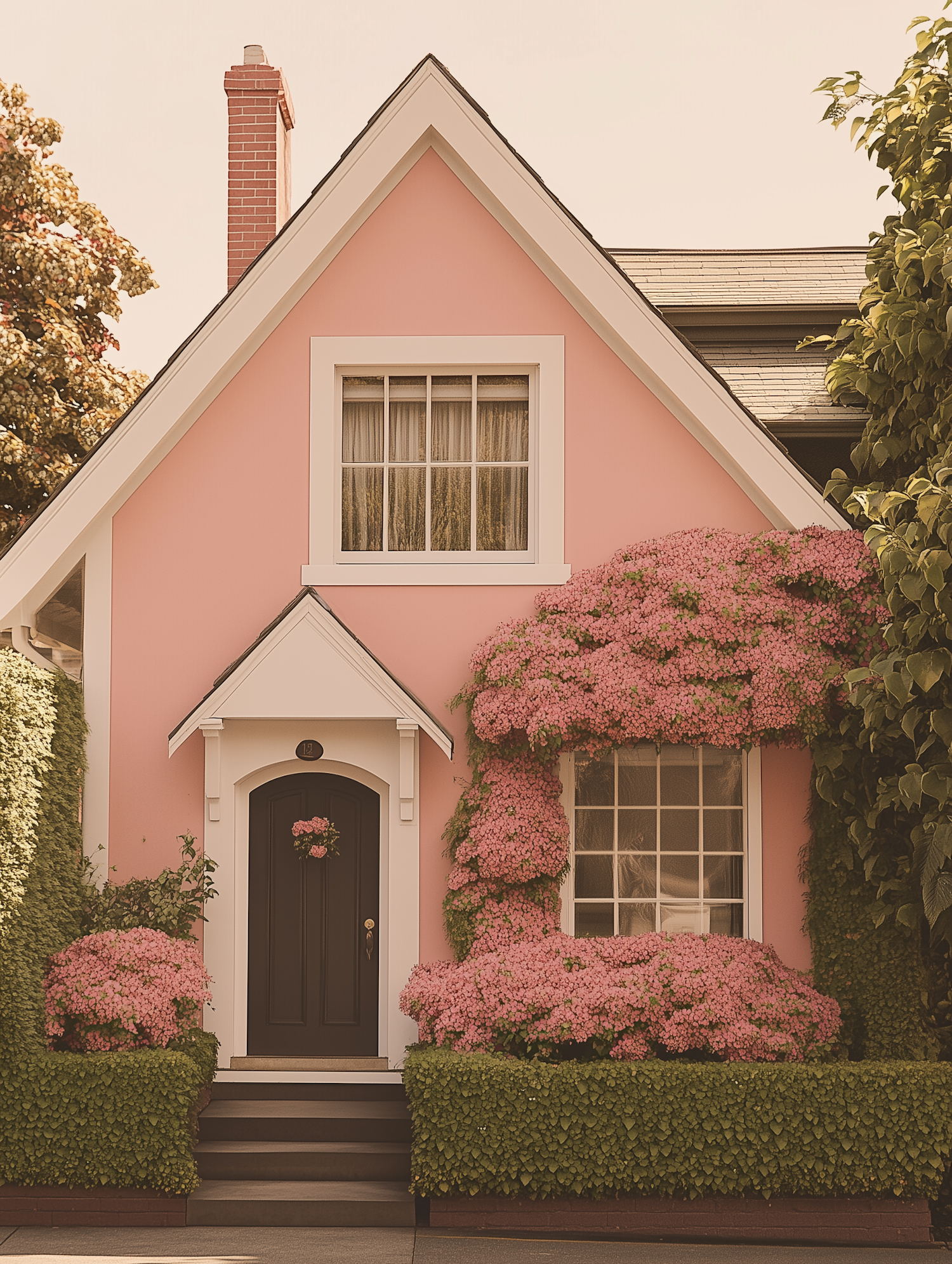 Charming pink house with floral vines, white trim, and a black door. Surrounded by lush greenery, it exudes cozy, storybook charm.