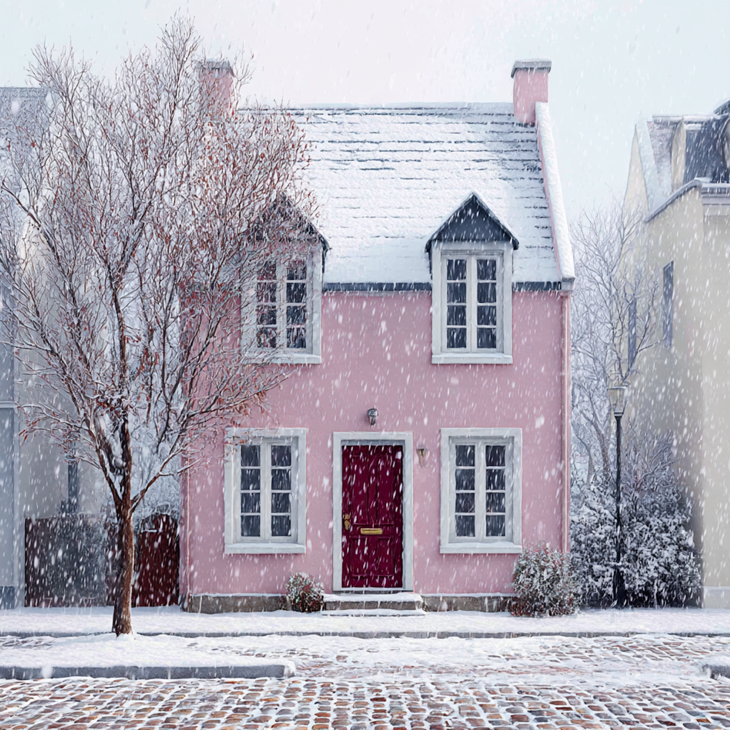 A picturesque pink house with a red door in a snowy setting, surrounded by a cobblestone street and a serene winter atmosphere.