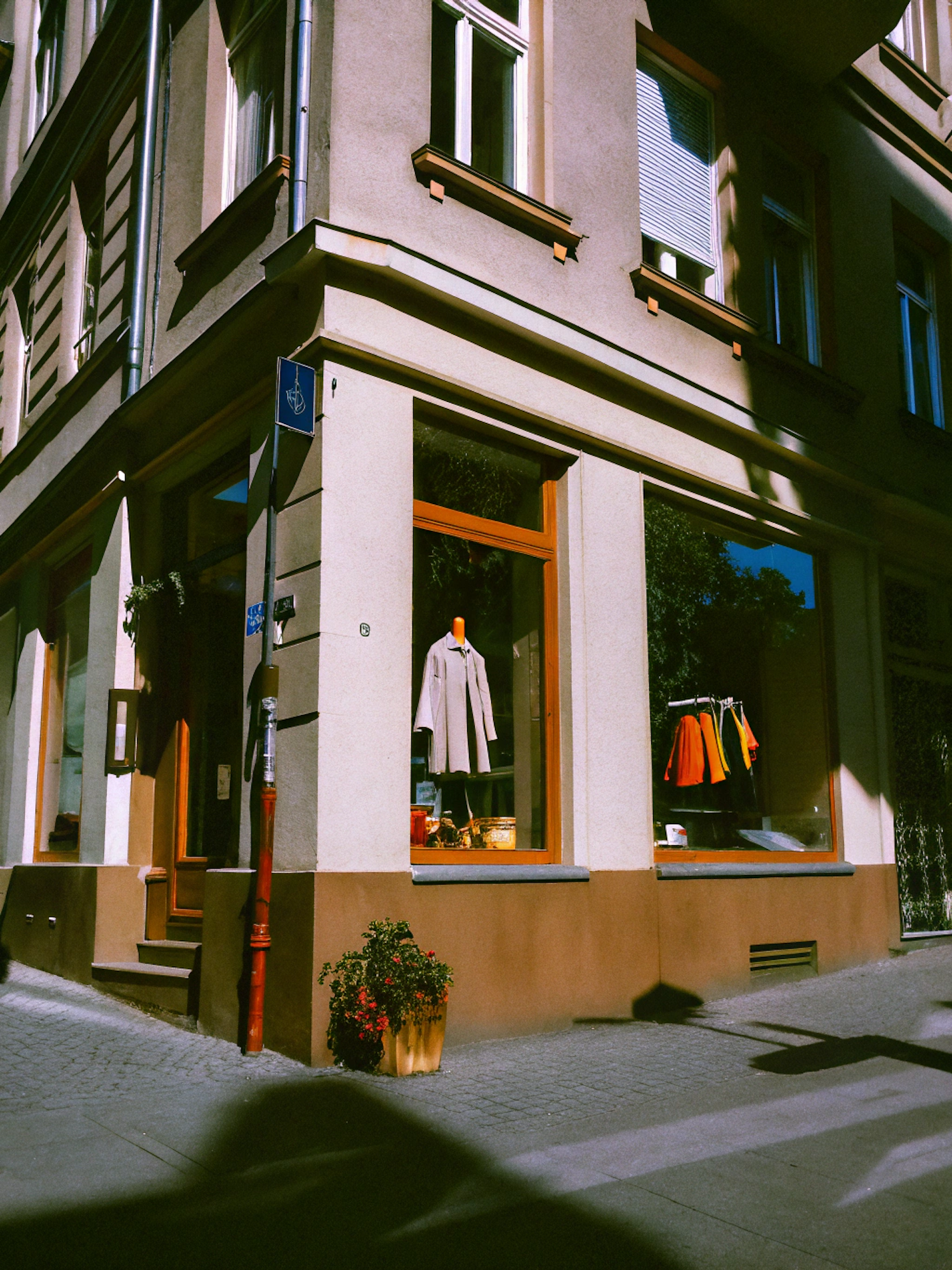 Charming corner clothing store with beige walls, vibrant window displays, and a potted plant on a cobblestone street.