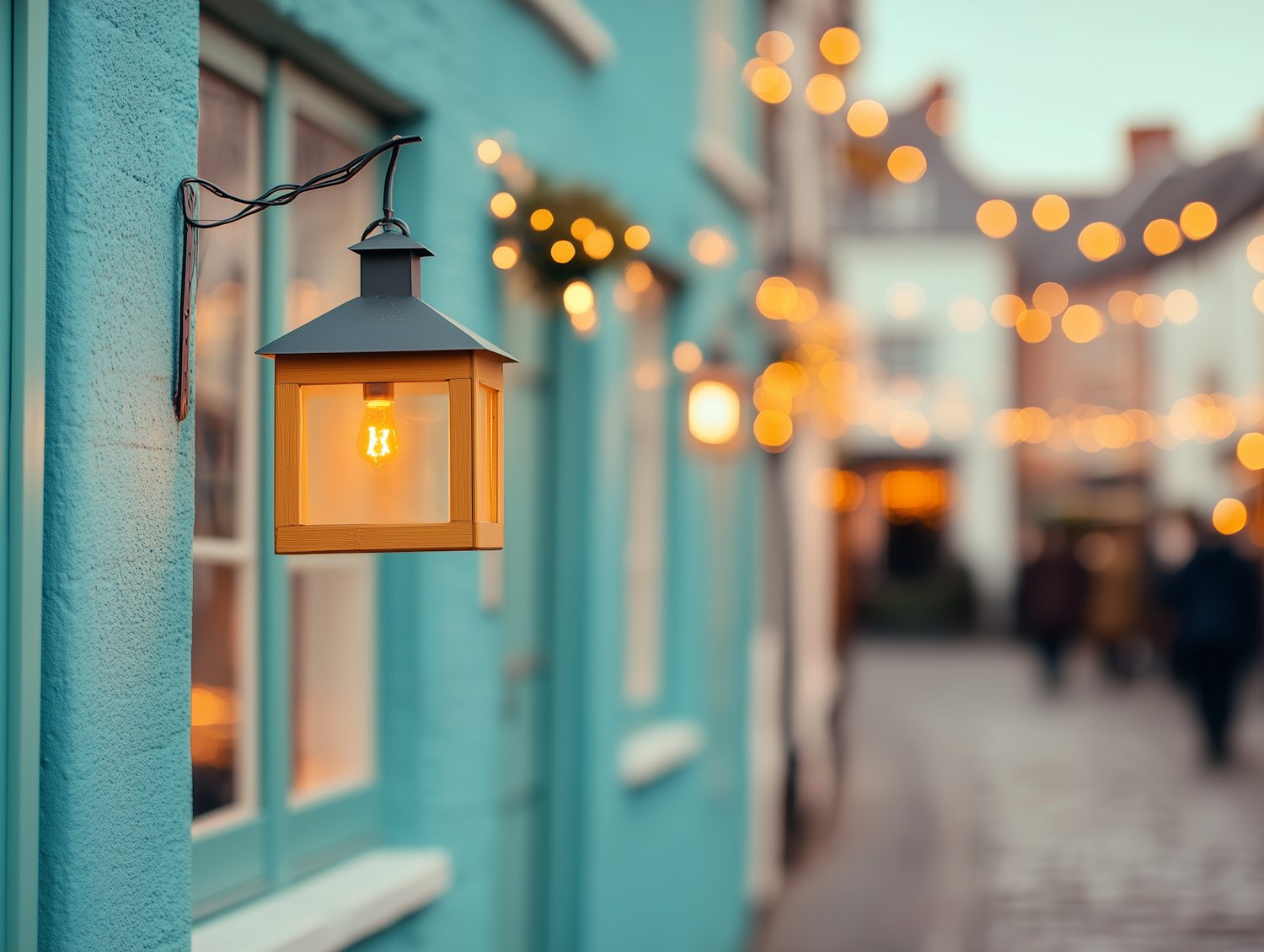Charming street with a glowing lantern on a turquoise wall, surrounded by festive bokeh lights and a cobblestone path.