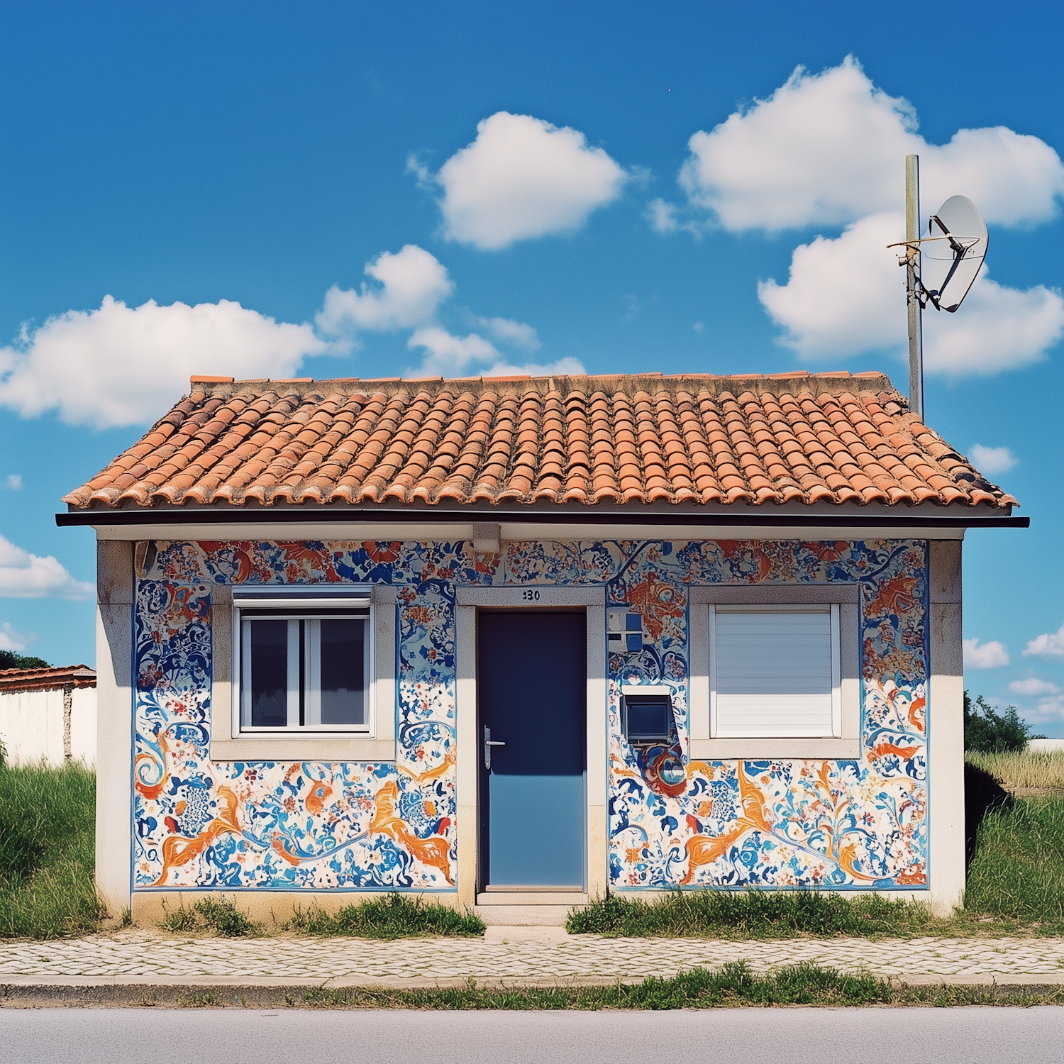 Charming small house with colorful tilework, terracotta roof, and blue door under a bright sky with fluffy clouds.