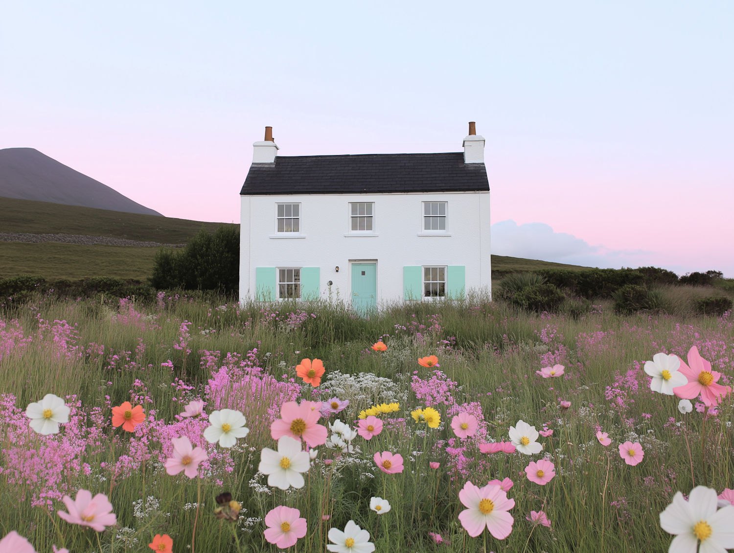 Charming white cottage with pastel shutters in a vibrant wildflower meadow under a serene pink and blue sky.