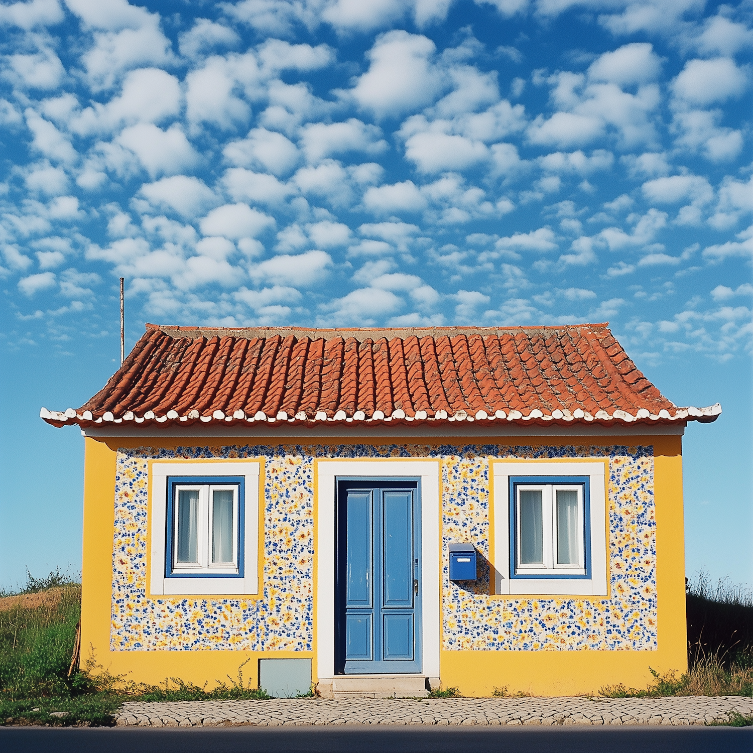 Bright yellow house with blue floral tiles, a red tiled roof, and a blue door under a vibrant sky with fluffy white clouds.