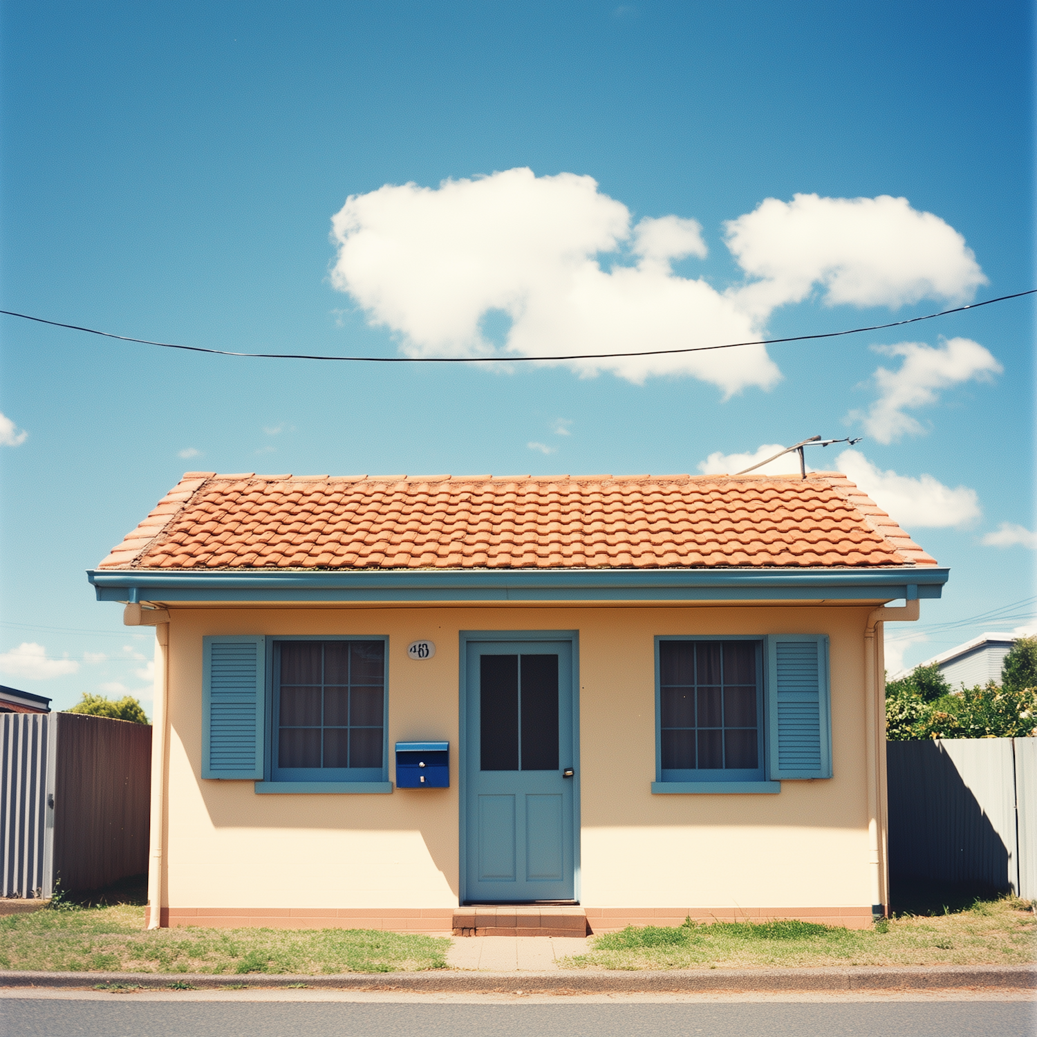 Charming small house with a yellow facade, red-tiled roof, and blue accents under a sunny sky. Perfect cozy home inspiration!