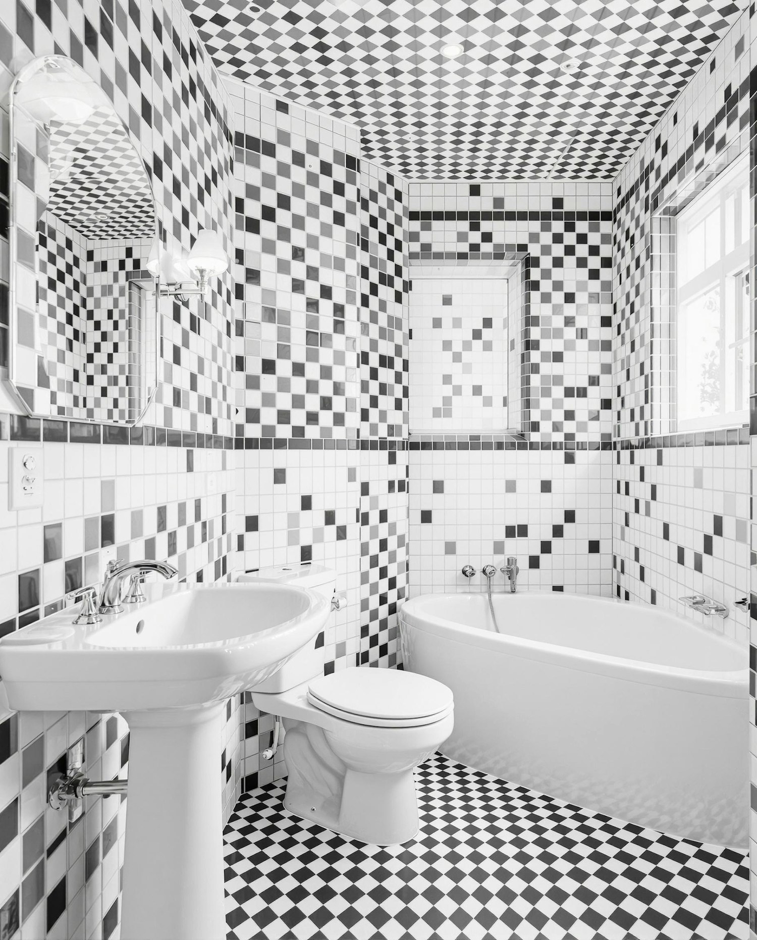 Bathroom entirely clad in black and white checkered tiles, from floor to ceiling, including the fixtures. Wide-angle view with centered composition.