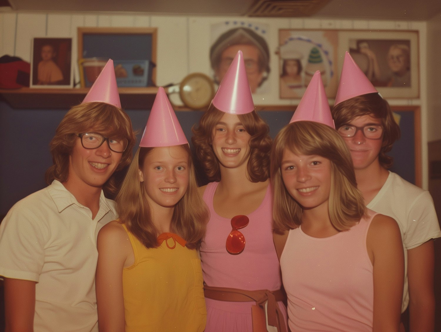 Five young friends in pink party hats celebrate indoors, smiling and enjoying the moment. Vibrant and joyful atmosphere.