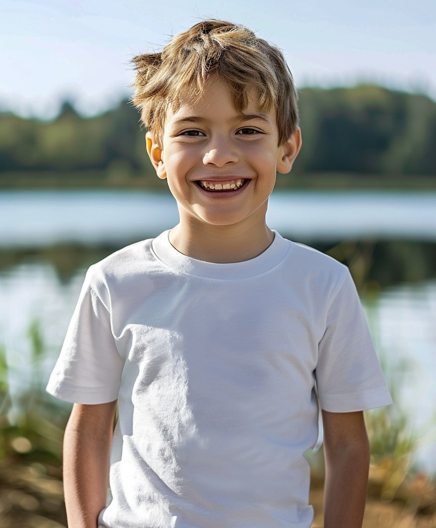 Smiling young boy in a white t-shirt outdoors by a lake, with sunlight highlighting his cheerful expression.