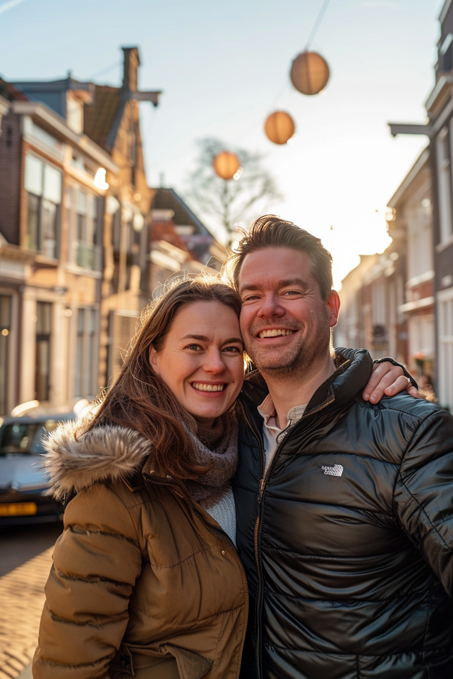 A happy couple in winter coats smiles warmly on a sunlit street with charming buildings and festive lanterns in the background.