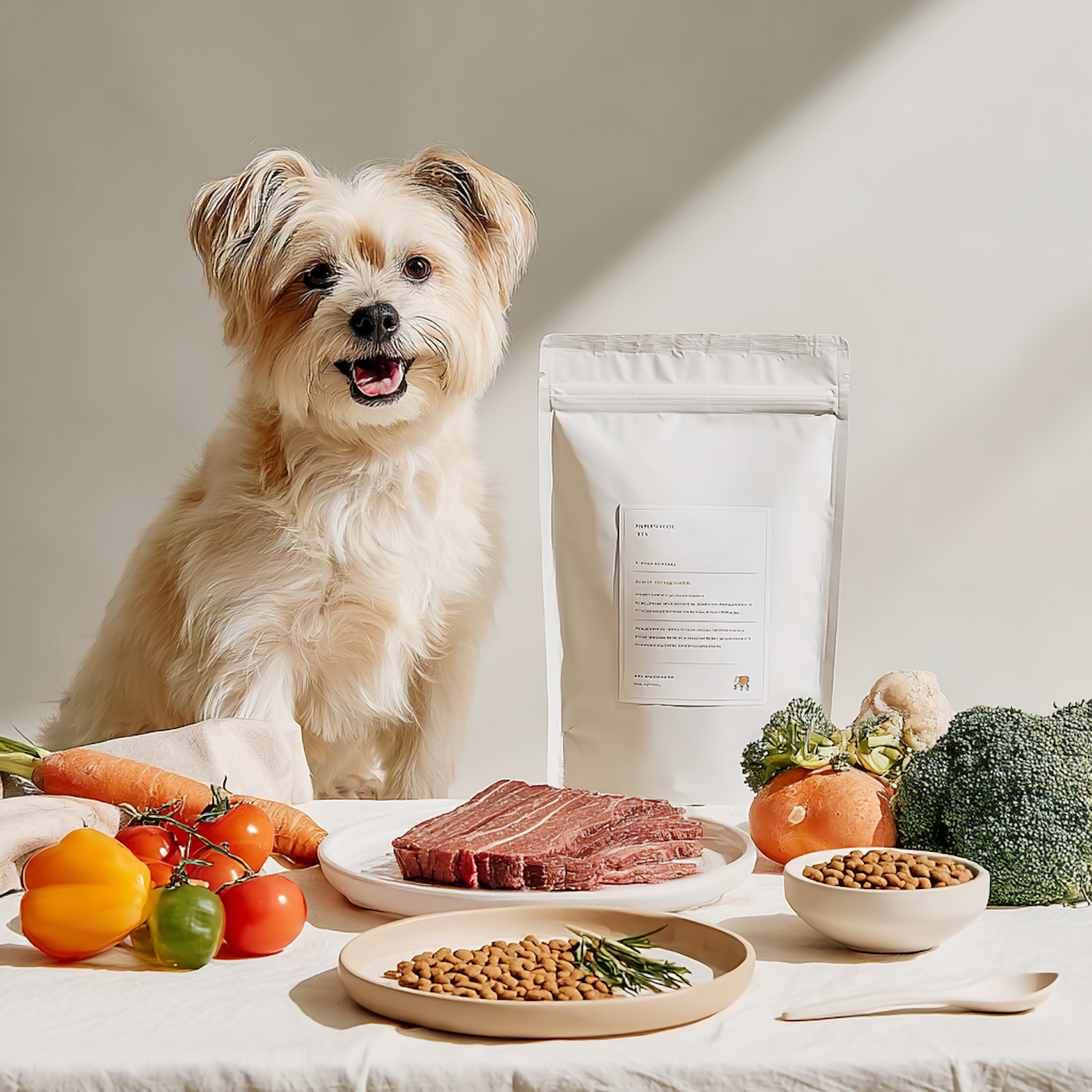 A happy dog sits beside a table with fresh vegetables, raw meat, and pet food, showcasing a healthy and natural diet for pets.