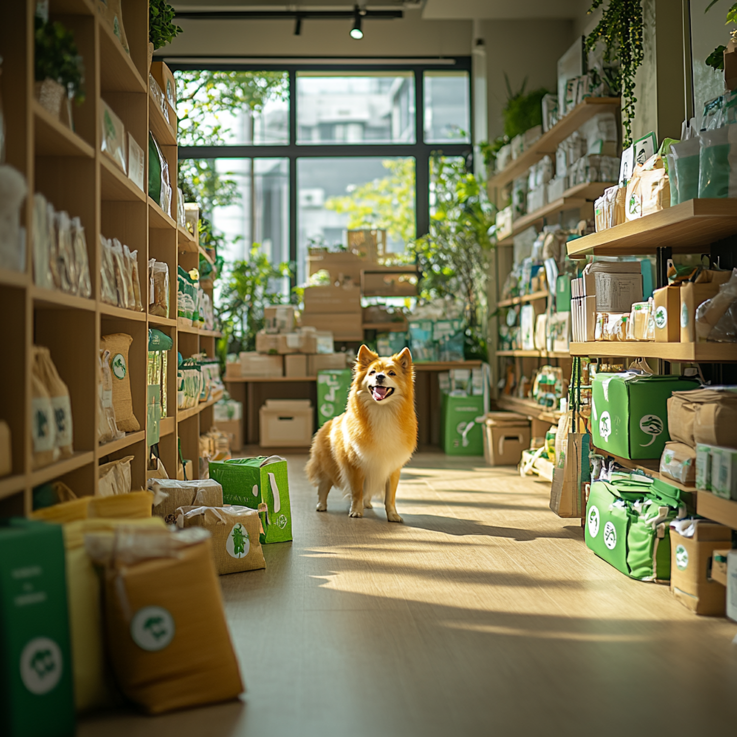 Eco-friendly store with sustainable products, greenery, and a cheerful golden-brown dog in the aisle under bright sunlight.
