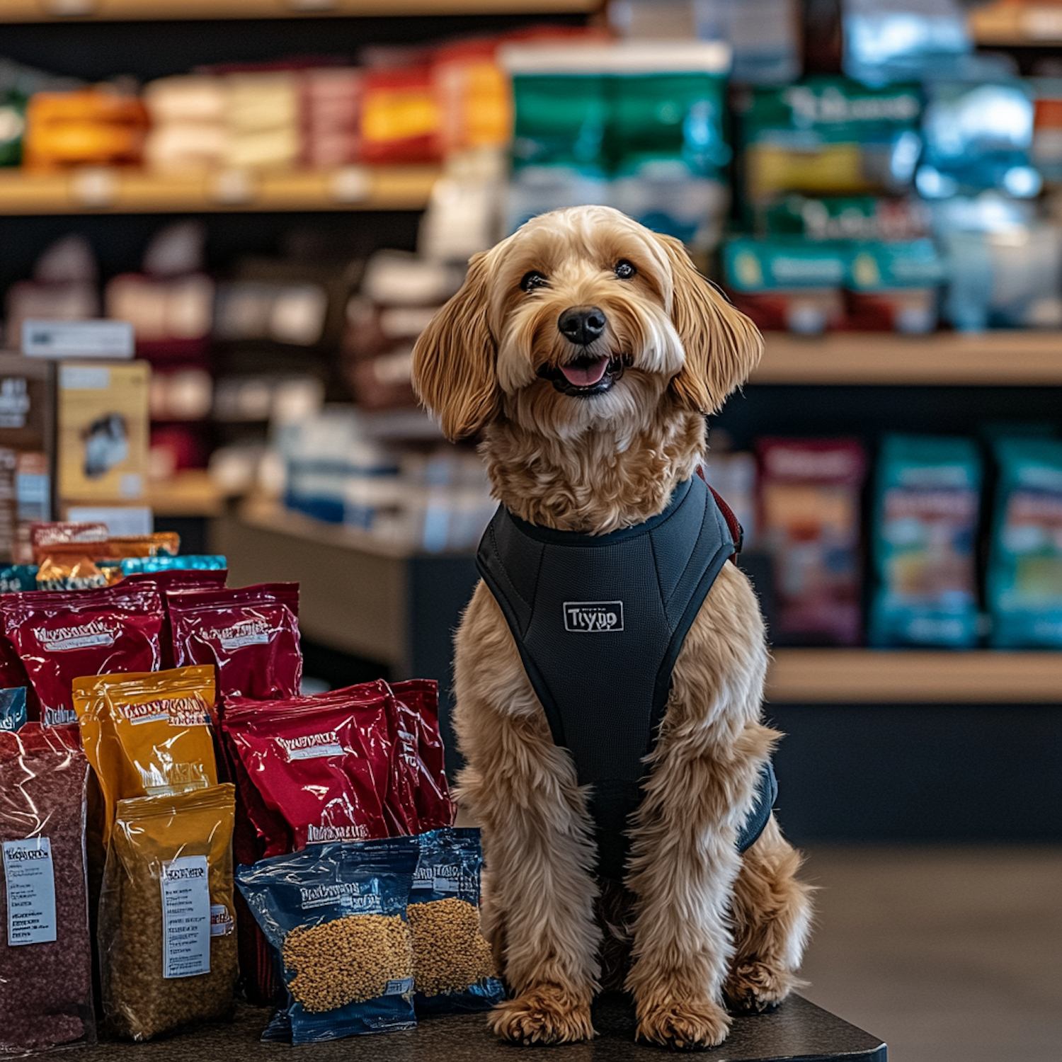 Adorable fluffy dog in a pet store, wearing a harness, surrounded by colorful pet food packages on a counter.