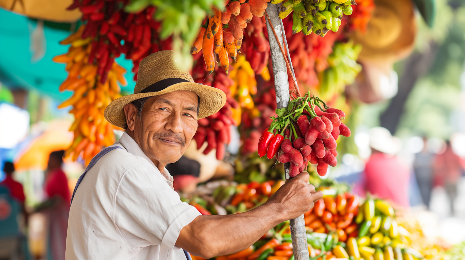 Smiling vendor in a straw hat at a colorful market stall with vibrant vegetables and fruits.