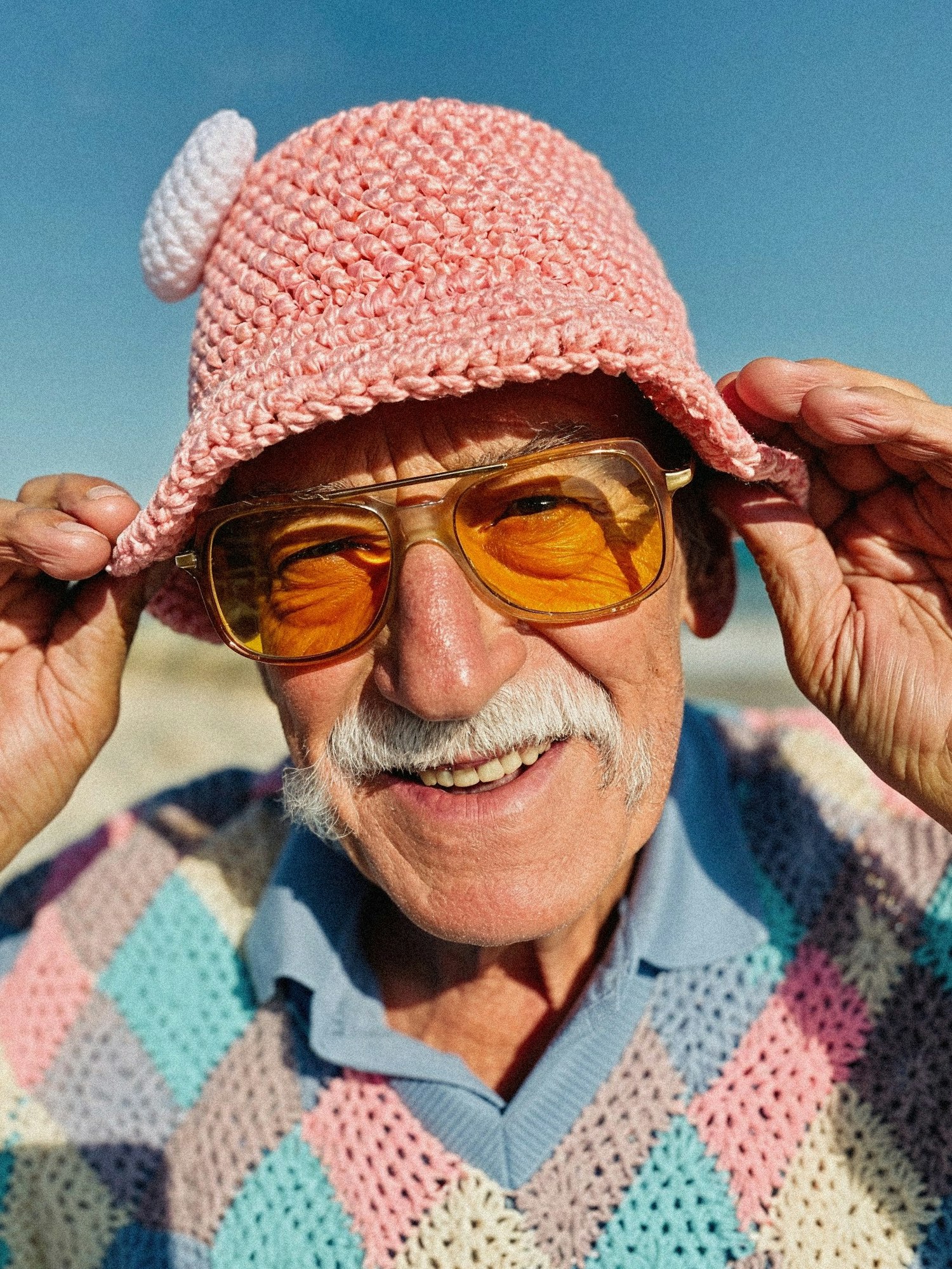 Cheerful elderly man in a pink crocheted hat, yellow glasses, and colorful sweater, enjoying a sunny day outdoors.